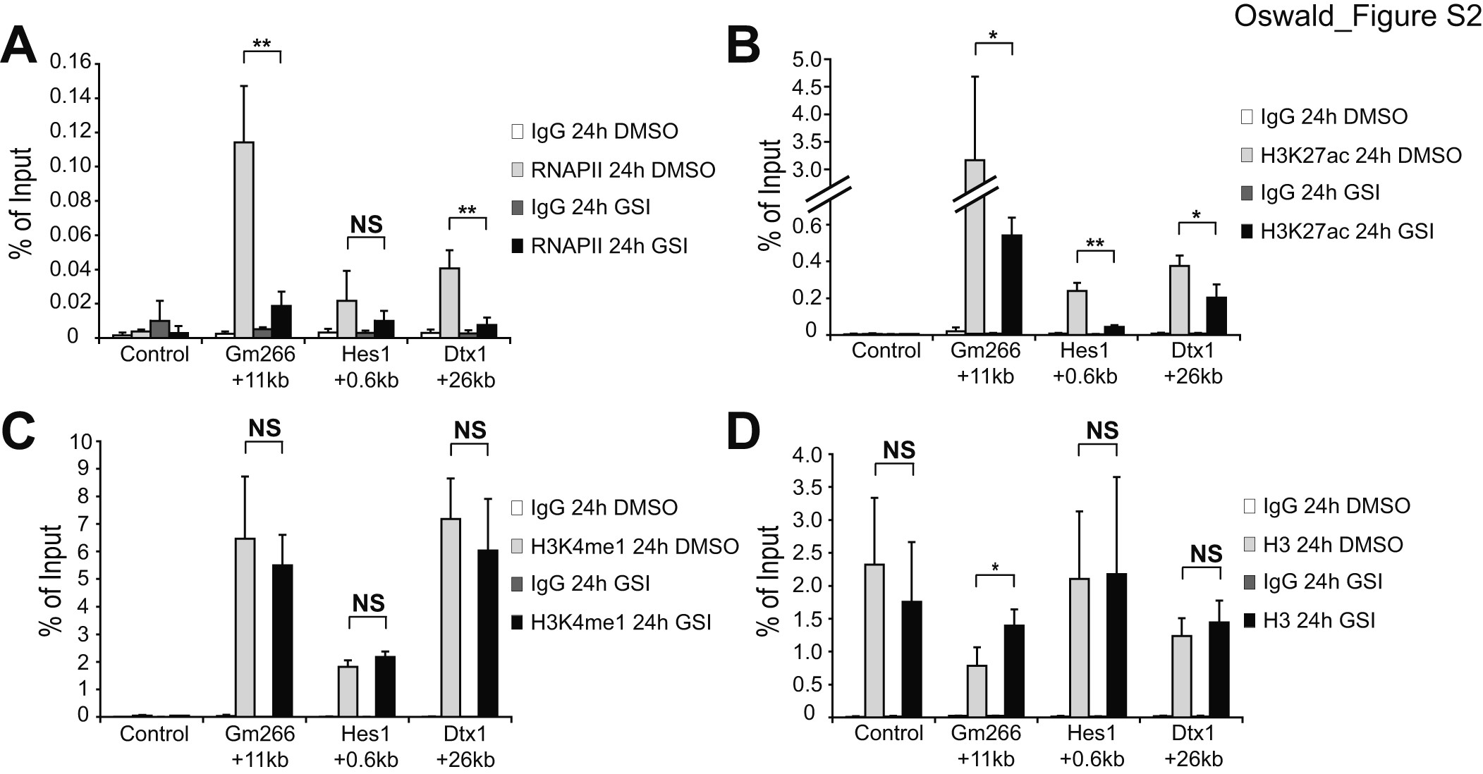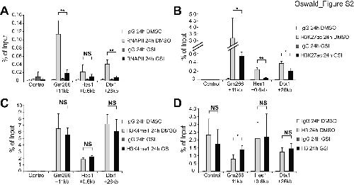 Figure S2. Notch-dependent regulation of RNA polymerase II, H3K27ac and H3K4me1 at the enhancer regions of Notch target genes. preT (Beko) cells were treated for 24h with GSI or with DMSO (control). (A) ChIP experiments reveal Notch-dependent dynamic recruitment of RNA polymerase II (RNAPII), changing levels of positive histone mark H3K27ac (B) whereas H3K4me1 remains constant (C). Data were normalized to the positive control (GAPDH 0kb) and in the case of (B) H3K27ac and (C) H3K4me1, data were further normalized to histone H3 (D). Shown is the mean ± SD of triplicate experiments ([NS] not significant, [*] P < 0.05, [**] P < 0.01, unpaired Student’s t-test). |