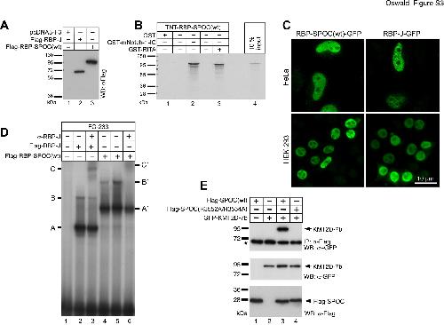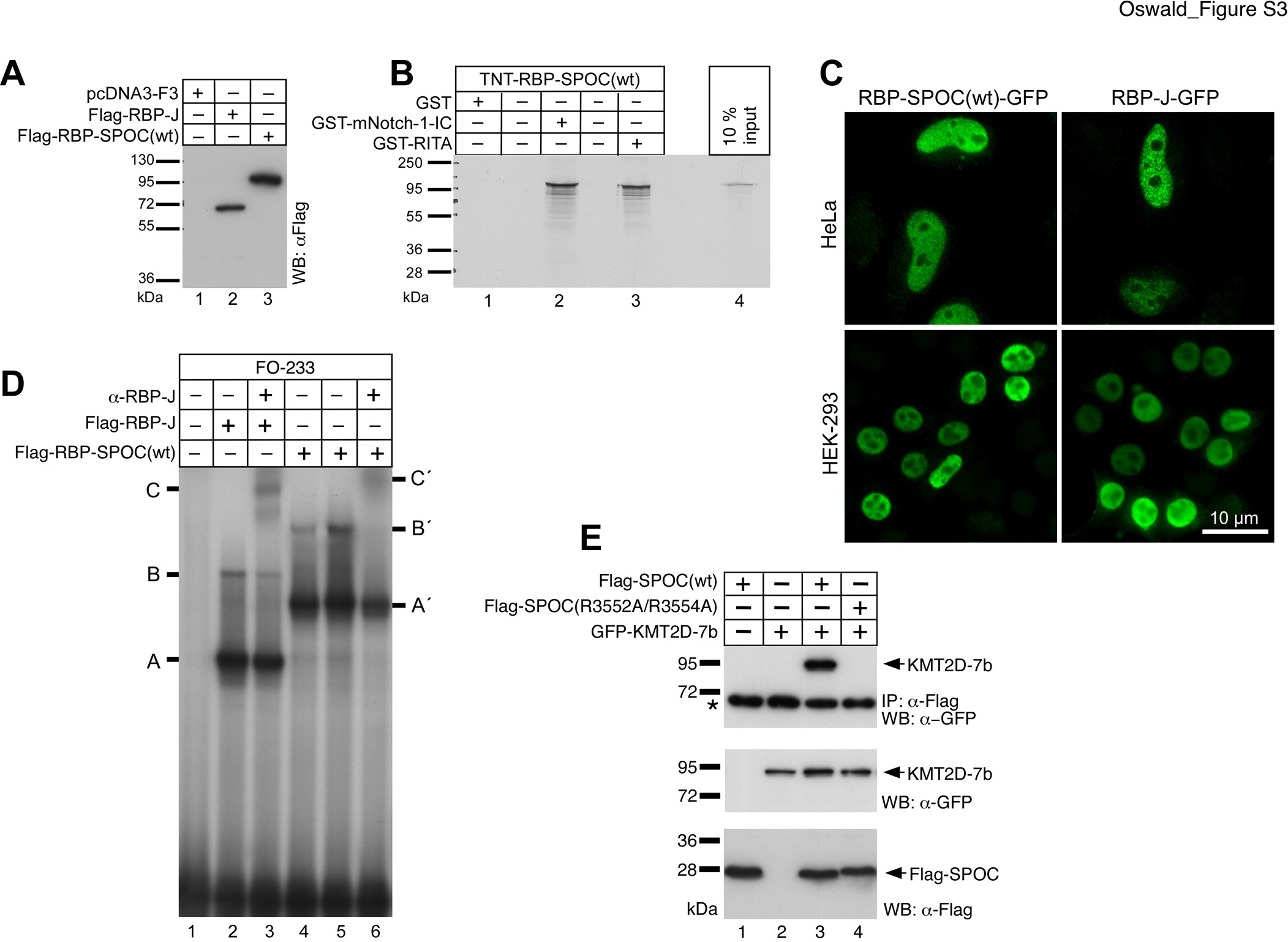 Figure S3. Characterization of RBP-SPOC fusion protein. (A) Expression of Flag-tagged RBP-J (lane 2) and Flag-tagged RBP-SPOC(wt) (lane 3) in transfected HEK293 cells, showing similar expression levels. Whole cellular extracts were analyzed by Western blotting using an anti-Flag antibody. (B) RBP-SPOC(wt) interacts with mNotch-IC and RITA in vitro. Cell free synthesized and 35S labeled RBP-SPOC(wt) binds to GST-mNotch-1-IC and GST-RITA, but not to GST alone, immobilized on GST-sepharose beads. (C) RBP-J (right panels) and RBP-SPOC(wt) (left panels) predominantly localize to the nucleus. HeLa cells (upper panels) and HEK-293 cells (lower panels) were analyzed by immunofluorescence microscopy using an anti-Flag antibody 24 hours after transfection. (D) RBP-J (lanes 2 and 3) and RBP-SPOC(wt) (lanes 4, 5 and 6) bind DNA similarly. Cell free synthesized RBP-J and RBP-SPOC(wt) were incubated with the 32P-labelled double-stranded oligonucleotide FO-233, which has two RBP-J binding sites, and used in an electromobility shift assay (EMSA). RBP-J specific DNA binding activity is shown by complexes A (single occupancy), B (double occupancy) and C (supershifted after addition of anti-RBP-J antibody, lane 3). RBP-SPOC(wt) DNA binding activity is shown by complexes A´ (single occupancy), B´ (double occupancy) and C´ (supershifted after addition of anti-RBP-J antibody, lane 6). (E) Mutations in the SPOC domain that impairs the SPOC/NCoR interaction also disrupt the SPOC/KMT2D interaction. HEK293 cells were transfected with the indicated expression constructs for Flag-tagged wild type SPOC domain [SPOC(wt)] or mutant SPOC domain [SPOC(R3552A/R3554A)] alone or together with the KMT2D-7b expression construct. Expression was verified by Western blotting for GFP-KMT2D-7b (middle panel, lanes 2, 3 and 4), Flag-SPOC(wt) (lower panel, lanes 1 and 3) and Flag-SPOC(R3552A/R3554A) (lower panel, lane 4). GFP-KMT2D-7b was co-immunoprecipitated with Flag-SPOC(wt) (upper panel, lane 3) but not with Flag-SPOC(R3552A/R3554A) (upper panel, lane 4). |