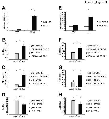 Figure S5. Inhibition of Casein Kinase 2 (CK2β) results in upregulation of Hes1 Notch target gene. (A) Mature T-cells were treated for 4 hours with 25 μM TBB or with DMSO as control and total RNA was purified and analyzed by qRT-PCR. Data were normalized to the housekeeping gene GusB (glucuronidase β). Shown is the mean ± SD of one representative experiment measured three times ([***] P <0.001, unpaired Student’s t-test). (B and C) As measured by ChIP, inhibition of Casein Kinase 2 (CK2β) by TBB in mature T-cells results in increased levels of (B) H3K4me3 and (C) H3K27ac at the Notch-dependent enhancer of Hes1 Notch target gene. (D) As revealed by ChIP using a pan H3 antibody, nucleosome occupancy is reduced at the enhancer of Hes1 Notch target gene upon TBB treatment in mature T-cells. Data were normalized to GAPDH 0kb and further normalized to histone H3. Shown is the mean ± SD of duplicate experiments measured twice each ([***] P < 0.001, unpaired Student’s t-test). (E) Mature T-cells were treated for 4 hours with 25 μM TBCA or with DMSO as control and total RNA was purified and analyzed by qRT-PCR. Data were normalized to the housekeeping gene GusB (glucuronidase β). Shown is the mean ± SD of one representative experiment measured three times ([**] P <0.01, unpaired Student’s t-test). (F and G) As measured by ChIP, inhibition of Casein Kinase 2 (CK2β) by TBCA in mature T-cells results in increased levels of (F) H3K4me3 and (G) H3K27ac at the Notch-dependent enhancer of Hes1 Notch target gene. (H) As revealed by ChIP using a pan H3 antibody, nucleosome occupancy is reduced at the enhancer of Hes1 Notch target gene upon TBCA treatment in mature T-cells. Data were normalized to GAPDH 0kb and further normalized to histone H3. Shown is the mean ± SD of duplicate experiments measured twice each ([*] P < 0.05, [**] P < 0.01, unpaired Student’s t-test). |