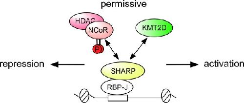 Figure 9. Model for the competing NCoR- and KMT2D-complex at Notch target genes. To keep an intermediate/permissive chromatin state, the RBP-J/SHARP complex recruits either activating KMT2D or repressing phospho-NCoR/HDAC complexes. The phospho-dependent competition between the two opposing chromatin modulators allows the incorporation of incoming signaling inputs to regulate Notch target genes responsiveness in the absence of Notch. The SHARP/NCoR interaction moves the balance versus the repressed state whereas the SHARP/KMT2D complex moves the balance versus the active state waiting for being displaced by NICD/p300. |