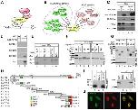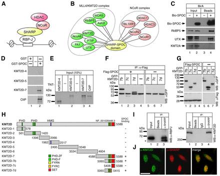 Figure 1. The KMT2D complex interacts with the SPOC-domain of SHARP. (A) Schematic representation of the RBP-J/SHARP repressor complex. SHARP interacts with RBP-J via its RBP interaction domain and with NCoR/HDAC complexes due to its C-terminal SPOC-domain. (B) SPOCome. A biotinylation-tagging approach followed by mass spectrometry was performed in pre-T cells and allowed to identify the KMT2D and NCoR complexes as interactors of the SPOC domain of SHARP. A complete list of interactors is provided in Supplementary Table S1. (C) Bio-SPOC interacts with KMT2D complex specific component UTX but not with KMT2A in pre-T cells. Streptavidin magnetic beads were used to pull-down the SPOC interactors. Precipitated proteins were analyzed by Western blot using streptavidin-HRP and specific antibodies directed against RbBP5, UTX and KMT2A. (D and E) The SPOC domain of SHARP interacts with the C-terminus of KMT2D in vitro. (D) Only the KMT2D-7 construct interacts with GST-SPOC (lane 2). CtIP, a known binding partner of SPOC, served as a positive control. (E) Input of the cell free synthesized 35S-labeled KMT2D fragments [(KMT2D-4, lane 1), (KMT2D-5, lane 2), (KMT2D-7, lane 3) and CtIP (lane 4, positive control) used in the GST pull-down experiments shown in Figure 1D. (F and G) Mapping of the SPOC-KMT2D interaction in cellular extracts. HEK293 cells were transfected with the indicated expression constructs for Flag-tagged SPOC domain of SHARP and GFP-tagged KMT2D fragments. (F) GFP-KMT2D fragments 7b (lane 1) and 7d (lane 3) coimmunoprecipitate with the SPOC domain of SHARP. A weak interaction was detected with the KMT2D-7c fragment (lane 2), which represents the SET domain of KMT2D (see also Figure 1H). HEK293 cells were transfected with the indicated expression constructs for Flag-tagged SPOC domain of SHARP and GFP-tagged KMT2D fragments. The asterisk denotes the heavy chain of the antibody used for immunoprecipitation. (G) Input control of the proteins used in (F). (H) Schematic representation of the KMT2D constructs used in (D)–(G) and their binding capacity to the SPOC-domain. Amino acid numbering is according to accession NP_001028448.3. KMT2D domains: PHD-zf, PHD-zinc finger (CCD: 197604); PHD-f, PHD-finger (CCD: 201356); HMG, HMG-box (CCD: 28965); FYRN, F/Y-rich N-terminus (CCD: 191411); FYRC, F/Y rich C-terminus (CCD: 197781); SET, SET domain (CCD: 197640). (I) Endogenous RBP-J (left panel, lane 3) and KMT2D (right panel, lane 4) interact with SHARP in HeLa cells. The asterisk denotes the heavy chain of the antibody used for immunoprecipitation. (J) KMT2D (left) and SHARP (middle) are located in the nuclei of HeLa cells and show regions of colocalization (right) as determined by confocal microscopy. Scale bar, 20 μm. |