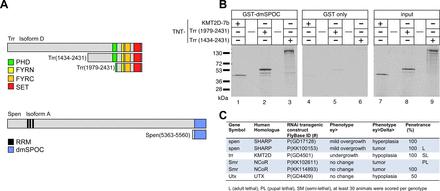 Figure 8. Physical interaction of Drosophila Spen/SHARP and Trr/KMT2D genetic interactions with Notch-induced eye growth. (A) Schematic representation of Drosophila melanogaster Trr and Spen constructs used in the GST pulldown experiments shown in panel (B). Amino acid numbering is according to accession AAN09063 (Trr, isoform D and AAF51535 (Spen, isoform A), (see also Materials and Methods for construct details). Trr and Spen domains: PHD, PHD-finger (cl02530); FYRN, F/Y-rich N-terminus (cl02650); FYRC, F/Y rich C-terminus (cl02651); SET, SET domain (cl02566); RRM, RNA recognition motif (cd00590); SPOC, Spen paralog and ortholog C-terminal domain (pfam07744). (B) The SPOC domain of the Drosophila Spen protein (dmSPOC) interacts with KMT2D and the Drosophila homolog of KMT2D (Trr) in GST-pulldown assays. Cell free synthesized and 35S labeled KMT2D-7b and Trr (1979–2431 and 1434–2431) (input, right panel) interact with GST-dmSPOC immobilized on GST sepharose beads (left panel), but not with GST alone (middle panel). (C) The eye tissue-specific depletion of spen, trr, smr, or utx using RNAi transgenic expression, alone and in the context of overexpression of Notch ligand Delta. The phenotype of mutant spen and smr can be grouped into hyperplasia whereas the mutant trr and utx display a hypoplastic phenotype. The RNAi trangenic flies are from the RNAi Collection stocks from Vienna Drosophila Resource Center (VDRC); ey> = eyeless-Gal4; ey>Delta> = eyeless-Gal4, UAS-Delta. |