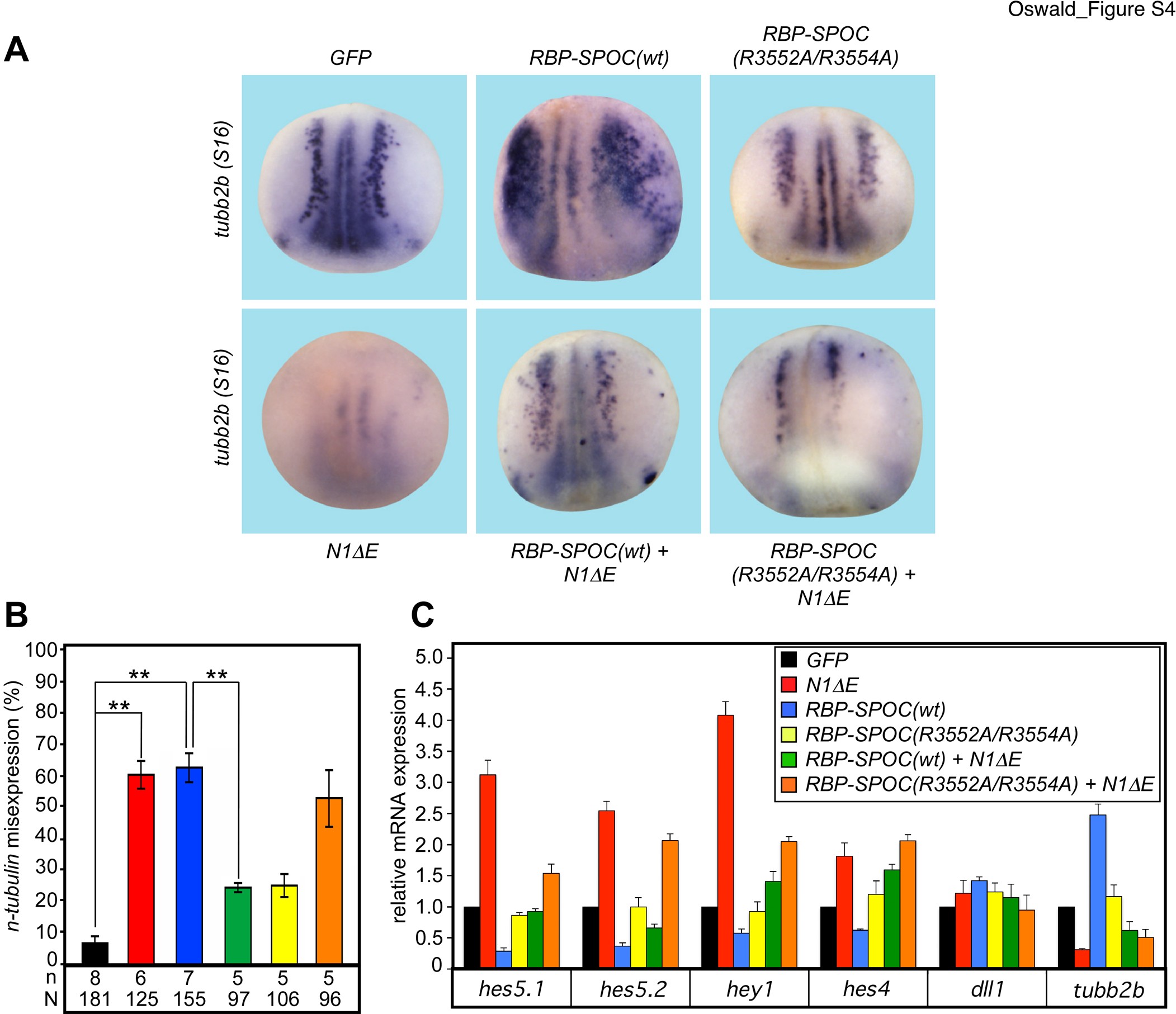Figure S4. Wildtype RBP-SPOC, but not mutant RBP-SPOC, interferes with neurogenesis in Xenopus laevis embryos. (A, B) Injection of Notch-1δE (N1δE) mRNA, a dominant active form of Notch, results in loss of primary neurogenesis (lower panel, left) compared to the GFP control (upper panel, left), as observed by loss of N-tubulin (tubb2b) staining in Xenopus embryos at stage 16 (S16). In contrast, injection of RBP-SPOC(wt) mRNA leads to an increase in primary neurons (upper panel, middle). This phenotype can be rescued by coinjection of N1δE (lower panel, middle). The mutant RBP-SPOC (R3552A/R3554A) shows no effect on primary neurogenesis (upper panel, right) and only a modest loss of primary neurons after coinjection with N1δE (lower panel, right). Numbers of injected embryos and phenotypes are listed in Supplementary Table 2. (C) Injection of Notch-1δE (N1δE, red bars) results in upregulation of Notch target genes (hes5.1, hes5.2, hey1 and hes4) and downregulation of N-Tubulin (tubb2b) as also monitored by whole mount in situ hybridization for tubb2 (A and B). Injection of RBP-SPOC(wt) (blue bars) results in the downregulation of Notch target genes and the upregulation of N-tubulin, which is rescued by coinjection of N1δE (green bars). Injection of RBP-SPOC (R3552A/R3554A) showed no effect on the expression of Notch target genes and N-tubulin (yellow bars). Coinjection of N1δE with RBP-SPOC (R3552A/R3554A) resulted in a mild upregulation of target genes and downregulation of N-tubulin (orange bars). Mean values and standard error of the mean (error bars) based on three experiments are shown. For panel B: N = total number of embryos anaylzed, n = number of independent embryo batches analyzed. |