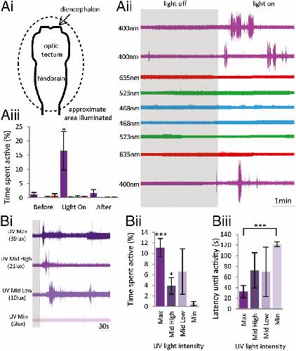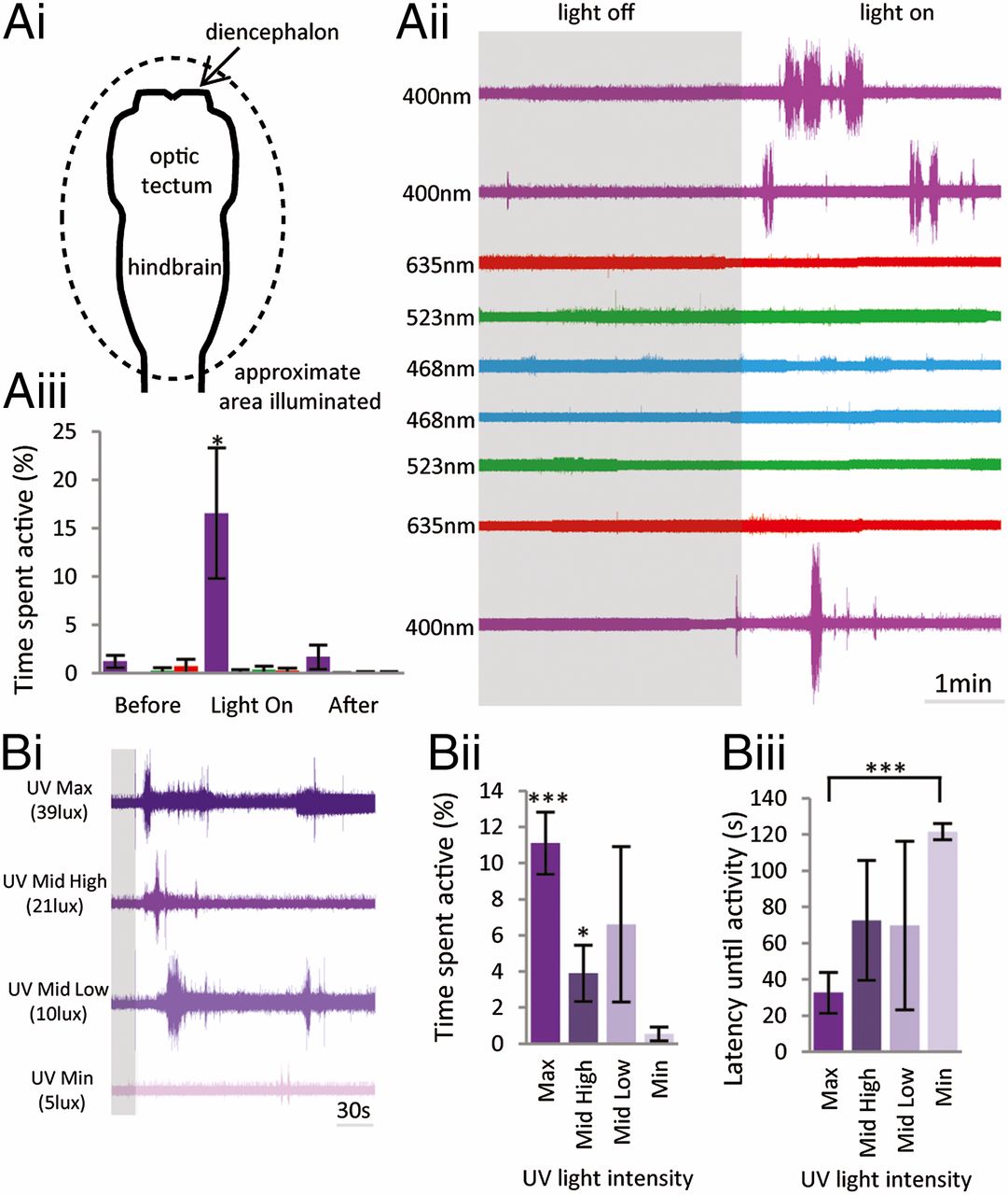 Fig. 2. Photosensitivity is tuned to short wavelengths. (A, i) Schematic depicting brainstem and caudal diencephalon. Approximate area illuminated is shown by the black dotted line. (A, ii) Ventral root trace from a stage 55 larva showing 200 s before and 200 s after a sequence of transitions from dark (gray box) to light. In each case, the preparation was illuminated following 10 min in the dark; the wavelength and intensity of light are shown. (A, iii) Graph displaying average data for time spent active 200 s before, during, and after 200-s illumination for each wavelength (UV, red, green, and blue; n = 7). (B, i) Sequence of responses to different intensities of UV light following 10 min in the dark. (B, ii) Graph showing average data for time spent active during responses to UV light at maximum (Max; 39 lx), medium high (21 lx), medium low (10 lx), and minimum (Min; 5 lx) intensity (n = 4). (B, iii) Graph showing average data for latency to first activity after illumination with UV light of different intensities. Error bars represent ±SEM; ***P < 0.01; *P < 0.05. |