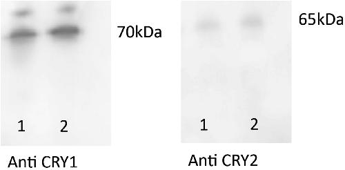 Fig. S7. Western blots for the detection of CRY1 and CRY2 in Xenopus samples. Stage 51 (lane 1) and adult (lane 2) Xenopus protein samples were run on 4â12% polyacrylamide gels and transferred to nitrocellulose membrane for Western blotting to detect CRY1 or CRY2 using a commercially sourced antibody (Aviva Systems Biology; 1:5,000 for CRY1 and 1:1,000 for CRY2). Positive bands at â¼70 and 65 kDa were obtained for both samples. This result revealed that the antibody specifically detected proteins of the correct size for Xenopus cryptochromes. |