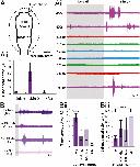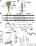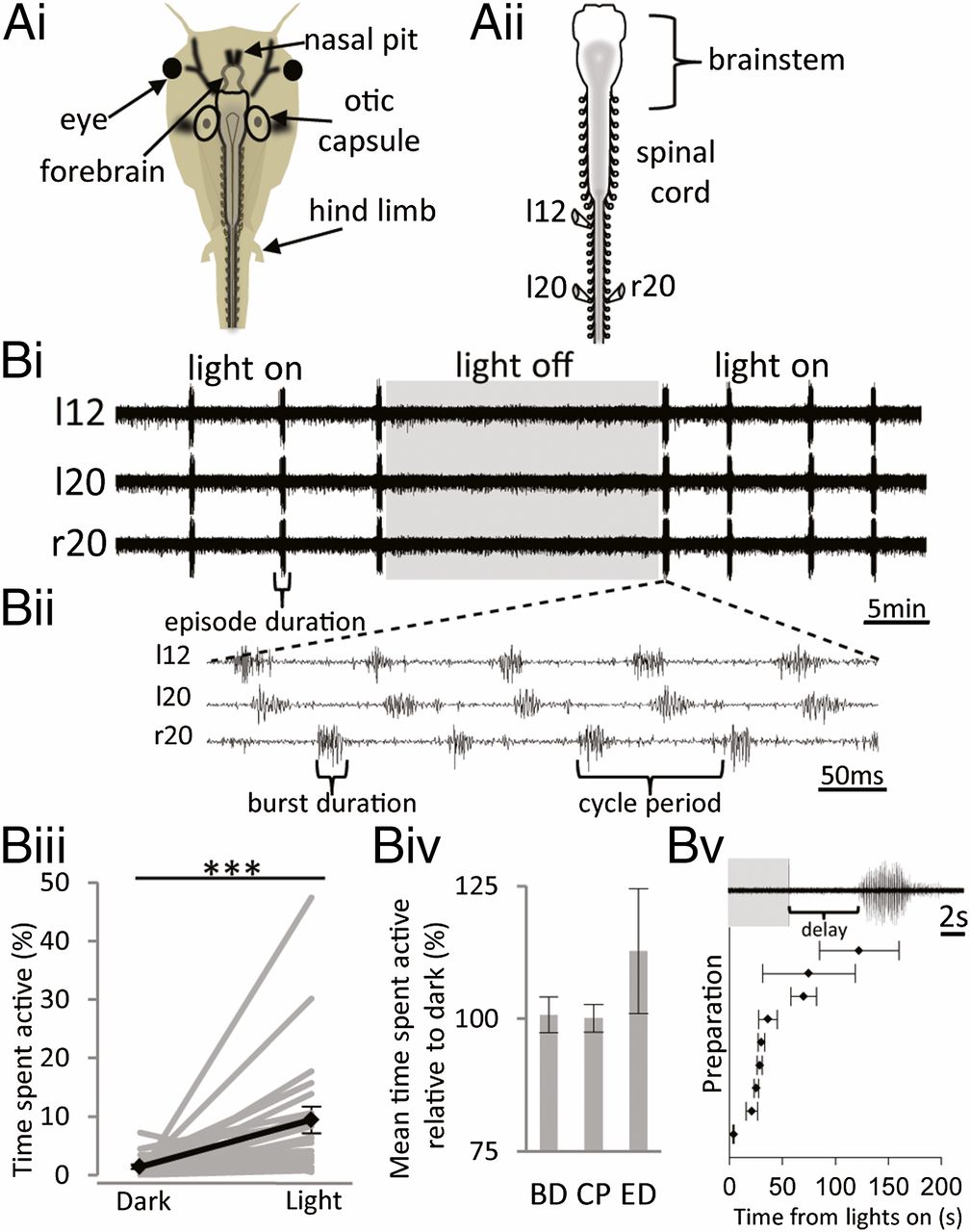 Fig. 1. Fictive locomotion in prometamorphic X. laevis larvae is sensitive to light. (A, i) Cartoon of stage 56 larva showing the approximate location of the central nervous system. (A, ii) Schematic depicting preparation with glass suction electrodes on ventral motor roots. (B, i) Extracellular record from three ventral motor roots showing spontaneous episodes of fictive locomotion. (B, ii) Expanded time base to show coordination of spontaneous rhythm and various parameters, including burst duration (BD), cycle period (CP), and episode duration (ED). Spontaneous activity is sensitive to ambient light levels. In the light, episodes of activity occur regularly every few minutes, whereas in the dark (gray box) the preparation falls silent. (B, iii) Graph of time spent active in light and dark, expressed as a percentage of total recording period, for 23 larval preparations (light-gray lines). The population mean is shown in black. (B, iv) Other parameters of fictive motor activity are unaffected; BD (n = 18), CP (n = 16), and ED (n = 23) are expressed as mean percentage in light relative to dark. (B, v) Graph of mean latency to motor activity from nine different preparations where at least three transitions between dark and light were recorded. In each example, the latency to activity was measured following 10 min in the dark. (Upper) Example response from a stage 54 larva following 10 min in the dark (gray box). Error bars represent ±SEM; ***P < 0.01. |