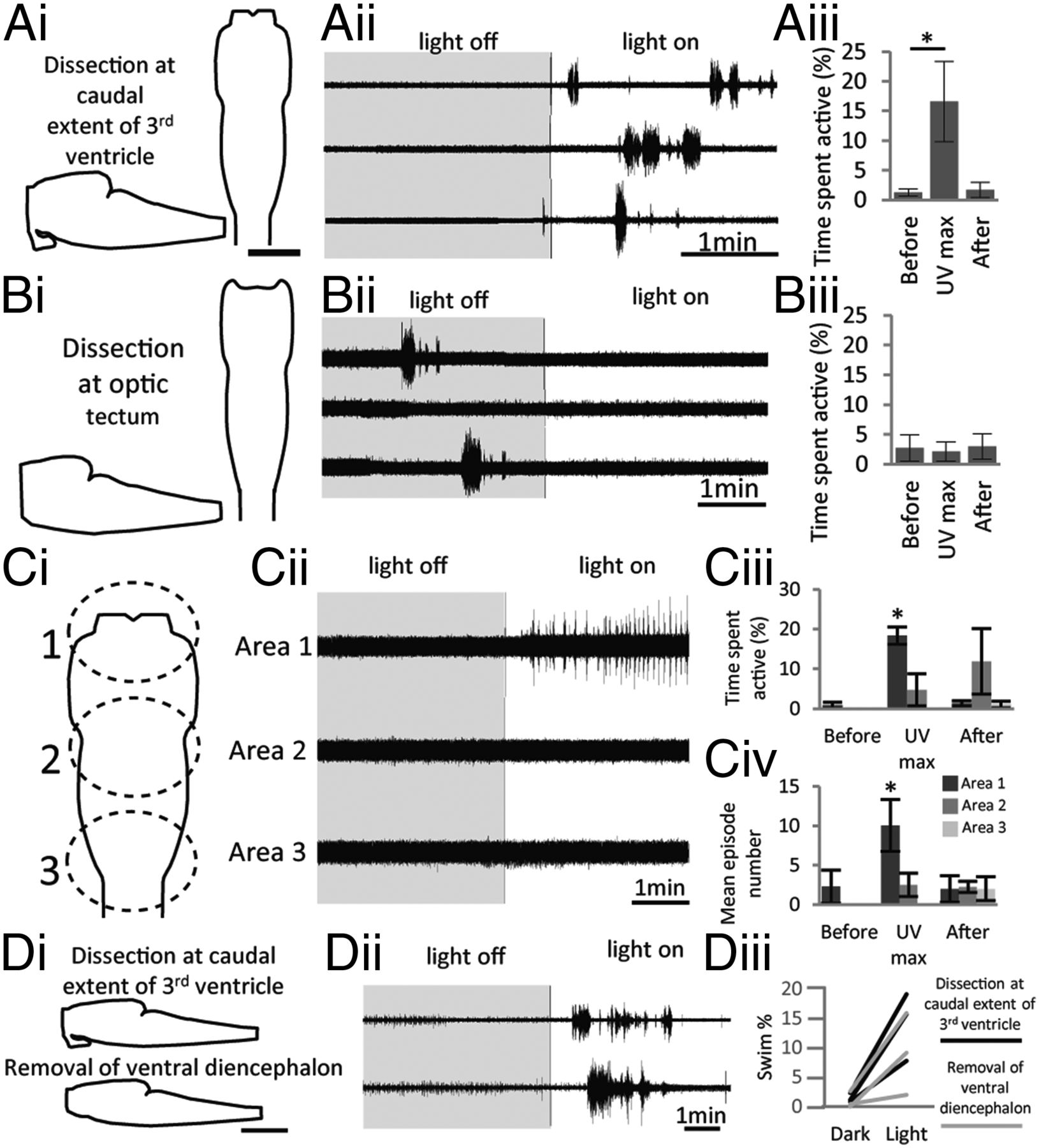 Fig. 3. Photosensitive tissue resides within the caudal diencephalon. (A, i) Schematic of the dissection performed: The forebrain is removed apart from a small portion of diencephalon caudal to the dorsal opening of the third ventricle. Both dorsal and sagittal aspects are depicted. (Scale bar, 200 µm.) (A, ii) Ventral root recording from a stage 54 larva showing three consecutive responses to illumination with UV light (400 nm; 39 lx). (A, iii) Graph of average data comparing time spent active 200 s before, during, and after illumination (n = 7). (B, i) Schematic illustrating the dissection made flush with the optic tectum to completely remove the diencephalon. (B, ii and iii) Equivalent data to A displayed for preparations lacking the diencephalon (n = 4). (C, i) Schematic illustrating the approximate location of focal illumination of three areas of isolated nervous system. (C, ii) Sequence of responses to illumination of these different areas with UV light following 10 min in the dark (gray box). (C, iii and iv) Graphs showing average data for time spent active (C, iii) and mean episode number (C, iv) for illumination of each area; comparison of 200 s before, during, and after illumination are plotted (n = 4). (D, i) Schematic illustrating isolated nervous system before (Upper) and after (Lower) removal of the ventral diencephalon containing the hypothalamus and pituitary. (D, ii) Ventral root recording from a stage 56 larva before (Upper) and after (Lower) the dissection was performed. (D, iii) Graph illustrating data from three different preparations. Swim % is shown both before (black line) and after (gray lines) removal of the ventral diencephalon. Error bars represent ±SEM; *P < 0.05. |