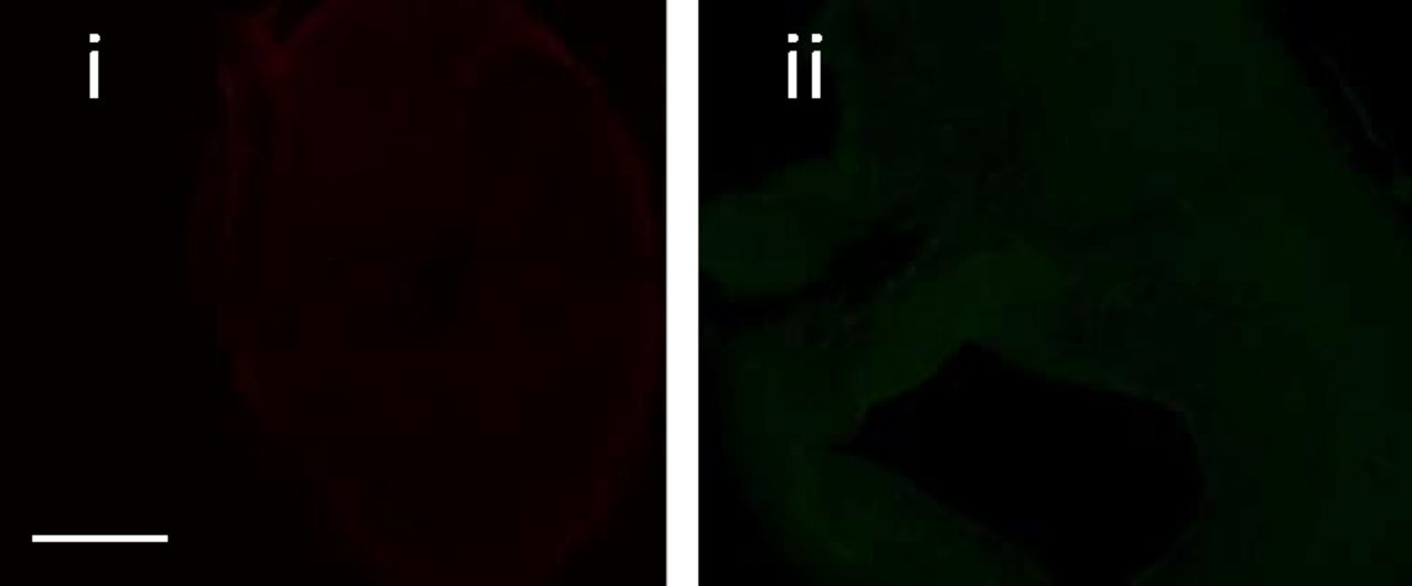 Fig. S1. Controls for secondary antibodies. Negative controls lacking primary antibody. (i) Texas red secondary. (ii) FITC secondary. (Scale bar, 100 μm.) |