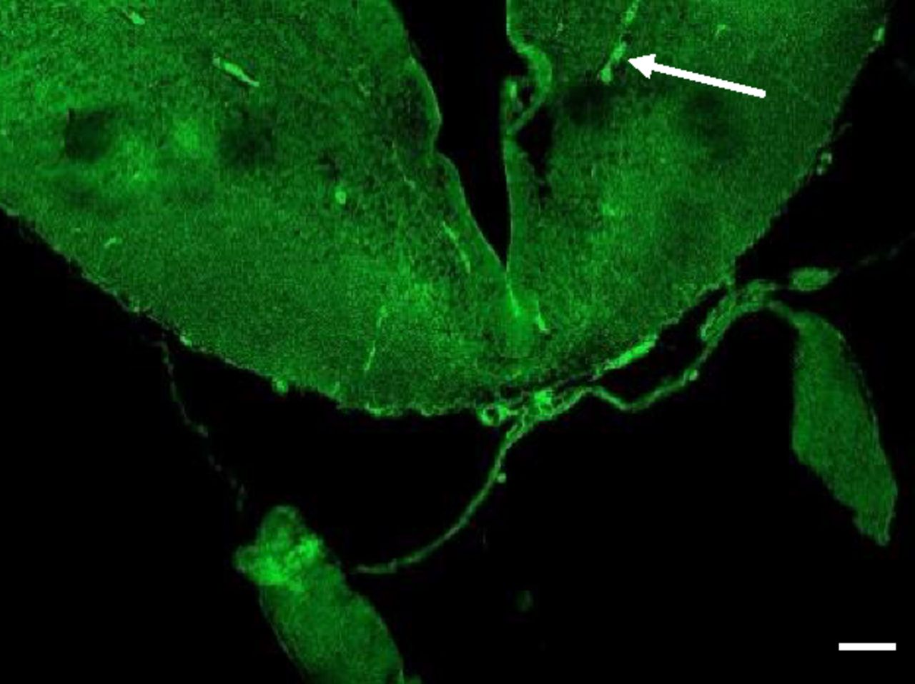 Fig. S6. Positive immunoreactivity for OPN5 in the Xenopus nervous system. OPN5-positive immunoreactivity was observed in specific regions of the nervous system, including the cells in the spinal cord (ii). A control section stained with preabsorbed OPN5 is also shown (i). (Scale bar, 150 μm.) |