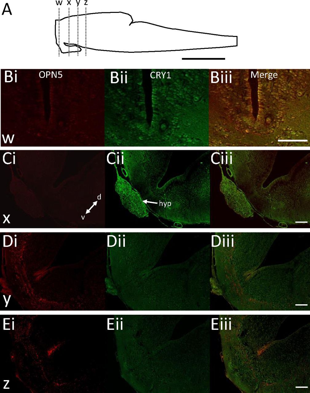 Fig. S3. OPN5 and CRY1 are expressed throughout the nervous system. (A) Schematic of a Xenopus tadpole brain showing the approximate position of sections taken for imaging. (BâE) Immunohistochemistry showing OPN5 and CRY1 expression within the ventral half of the preparation at three distinct anatomical levels moving caudally from the region of light sensitivity. d, dorsal; v, ventral. (C, ii) CRY1 is strongly expressed within the hypothalamus (hyp), the region surgically removed in Fig. 3D, without loss of light sensitivity. [Scale bars, 200 μm (A) and 100 μm (BâE).] |