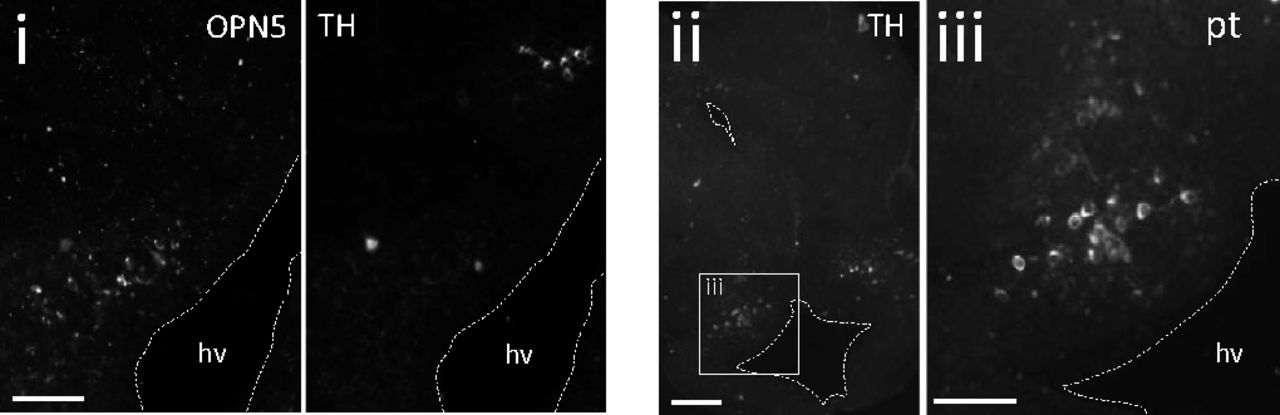 Fig. S4. OPN5 is not found within dopaminergic neurons within the light-sensitive region of the diencephalon. The OPN5 neurons in the caudal diencephalon are in close proximity to the rostral extent of the dopaminergic neurons of the posterior tuberculum. OPN5-positive neurons (i, Left) and TH-positive neurons (i, Right) are found in close proximity to each other within the caudal diencephalon. The TH-positive neurons are the rostral-most members of the dopaminergic neurons of the posterior tuberculum (pt) shown more caudally in the same animal (ii; magnification in iii). (Scale bars, 100 μm.) |