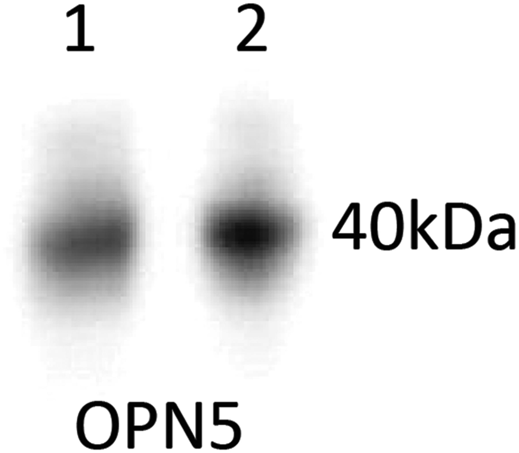 Fig. S5. Western blot for OPN5 detection in X. laevis protein samples. Stage 51 (lane 1) and adult (lane 2) Xenopus protein samples were run on 4â12% polyacrylamide gels and transferred to nitrocellulose membrane for Western blotting to detect OPN5 using the antibody described above at 1:5,000. Positive bands at â¼40 kDa were obtained for both samples. This finding revealed that the antibody specifically detected a protein of the correct size for Xenopus OPN5. |