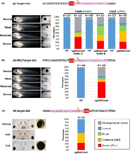 Figure 1. Targeted gene disruption of tyrosinase (tyr), solute carrier family 45 member 2 (slc45a2) and leukocyte tyrosine kinase (ltk) using Cas9 protein or Cas9 mRNA with sgRNA in Xenopus tropicalis founders. sgRNA target protospacer sequences are shown by pink letters, and protospacer-adjacent motif (PAM) sequences are shown in red boxes. (A) Disruption of tyr in founders. (Left) Representative phenotypes of tyr-disrupted embryos. Phenotypes were classified into four groups: severe, near complete loss of pigmentation in retinal pigmented epithelium (RPE); moderate, more than half of pigmentation lost; weak, less than half of pigmentation lost; and normal, no alteration in pigmentation. (Right) Frequencies of tyr-disrupted phenotypes. Injections of Cas9 protein with tyr sgRNA in buffer A or B were independently conducted three and two times, respectively. Injection of Cas9 mRNA with tyr sgRNA was independently carried out three times. (B) Disruption of slc45a2 in founders. (Left) Representative phenotypes of slc45a2-disrupted embryos using Cas9 mRNA and sgRNA. Phenotypes were classified into four groups as described for tyr phenotypes. Severe phenotype was near complete pigmentation loss. (Right) Frequencies of slc45a2-disrupted phenotypes from three independent experiments. (C) Disruption of ltk in founders. (Left) Representative phenotypes of ltk-disrupted tadpoles using Cas9 mRNA and sgRNA. Phenotypes were classified into three groups: full, the loss of iridescence in both eyes; half, the loss of iridescence in either eye; and normal, no alteration in iridescence in both eyes. (Right) Frequencies of ltk-disrupted phenotypes from two independent experiments. Total numbers of individuals are shown at the top of each graph. In vitro fertilization (IVF) indicates control embryos without injection |