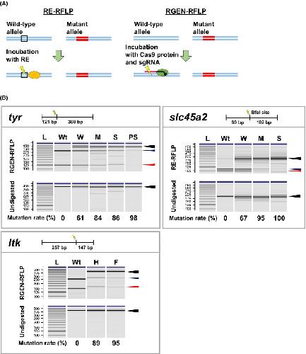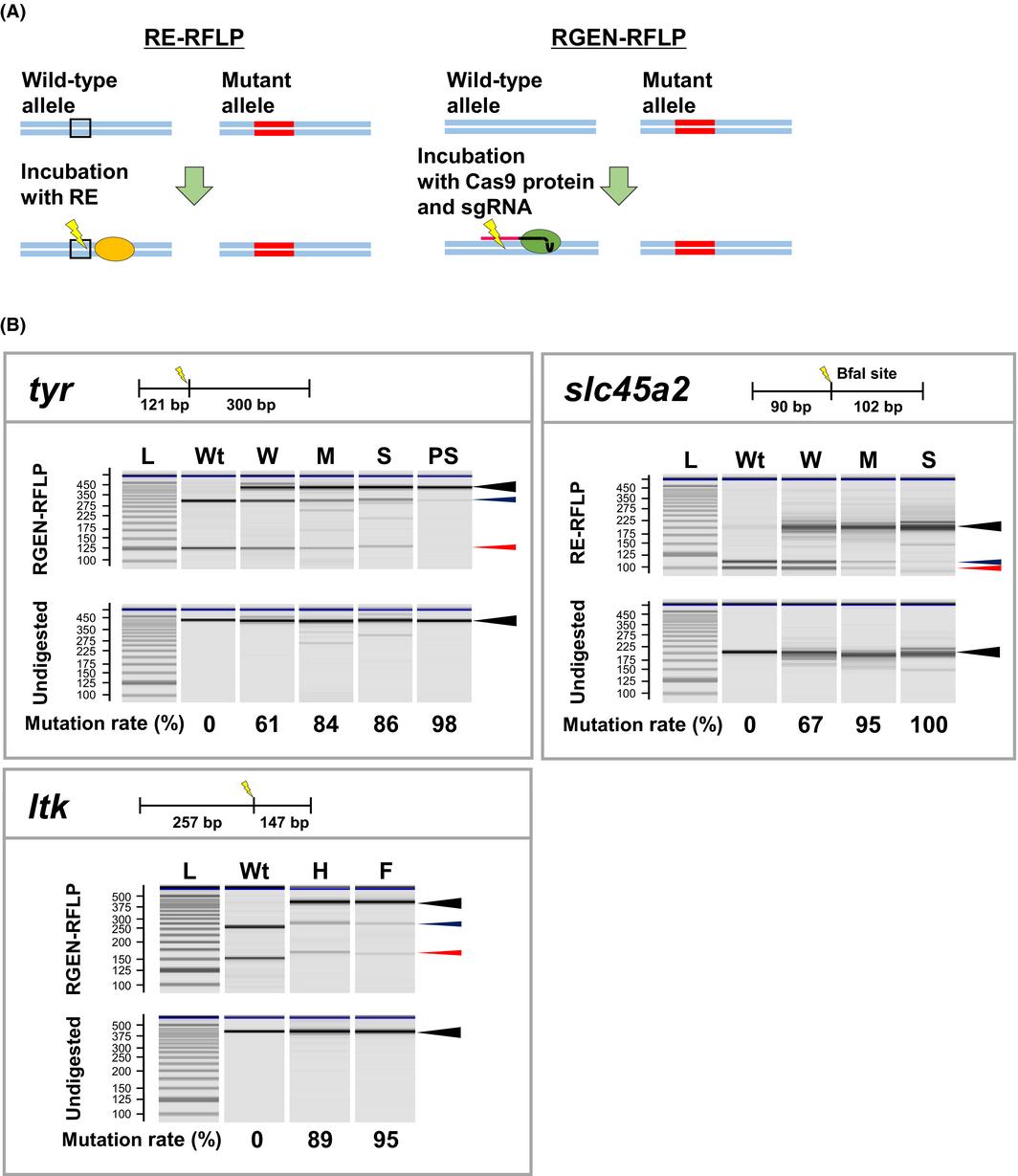 Figure 4. Genotyping of founders with different phenotypes with RFLP analyses. (A) A schematic of restriction enzyme-RFLP (RE-RFLP) and RNA-guided engineered nuclease-RFLP (RGEN-RFLP) analysis. (B) Estimation of somatic mutation rates of the target alleles in each phenotype. PCR products of tyr and ltk were cleaved by Cas9 protein with sgRNAs in vitro. PCR products of slc45a2 were cleaved by BfaI. Cleaved fragments were analyzed by electrophoresis (MultiNA system; Shimadzu). Upper and lower images show Cas9 protein or BfaI (+) and (â) gel images converted from electropherograms. PCR products of target regions are shown by black arrowheads. Colored arrowheads indicate cleaved products by Cas9 or BfaI. Some extra bands were observed and thought to be large deletions and insertions. The mutation rates were calculated from the molarity of the uncleaved bands (black arrowheads and other extra bands) and the larger cleaved fragments (blue arrowheads). Wt, wild type; W, weak phenotype; M, moderate phenotype; S, severe phenotype; PS, severe phenotype by Cas9 protein injection; H, half phenotype; F, full phenotype. Full scan images of RFLP analyses are shown in Figs S5âS8 in Supporting Information. |