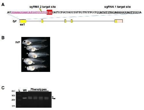 Figure S2. Phenocopy of tyr using Cas9 mRNA with another sgRNA in X. tropicalis founders and somatic mutation analysis using HMA. (A) Schematic of the genomic structure of the tyr gene and sgRNA targeting sites. Coding and untranslated exons are shown as yellow and cream coloured boxes, respectively. One (sgRNA1) was originally used in the main study, the other (sgRNA2) was made by shifting upstream from the original target site to confirm the resulting phenotypes. sgRNA target protospacer sequences are shown by pink letters and PAM sequences are highlighted in red boxes.(B) Disruption of tyr by sgRNA2 in founders. In vitro fertilisation (IVF) control embryos and representative phenotypes of tyr-disrupted embryos are shown (Asterisks). (C) Detection of targeted mutagenesis using HMA. Arrowheads and brackets indicate homoduplex and heteroduplex bands, respectively. Abbreviation; Wt, wild type. |