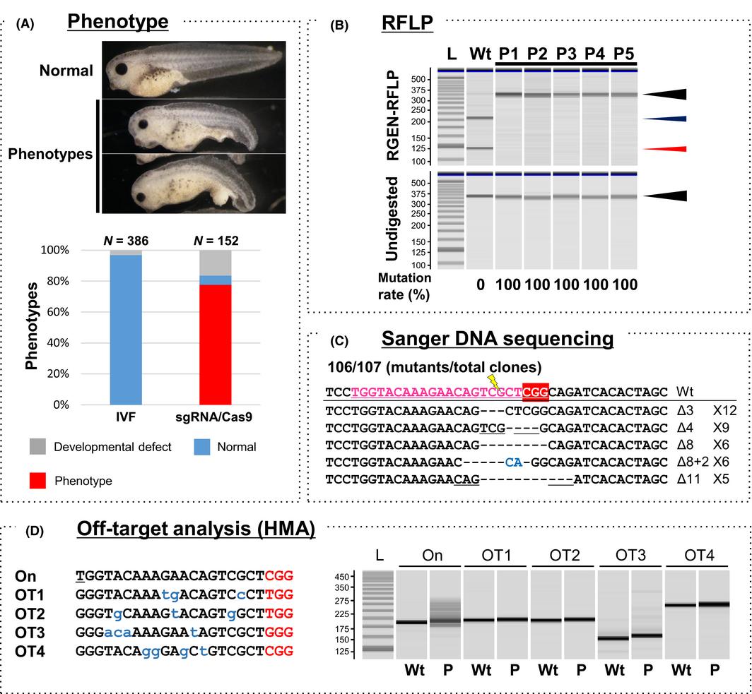 Figure 7. Example of target gene analysis according to our workflow. We designed an sgRNA targeting activin receptor-like kinase 2 (alk2). (A) Representative phenotypes produced by Cas9 mRNA and sgRNA (upper panel). Most phenotypes exhibited a partial loss of ventral fin tissue accompanied by the hypertrophic anus. Normal means no alteration in the ventral fin or anus. The total numbers of individuals are shown at the top of each graph. In vitro fertilization (IVF) indicates control embryos without injection. Frequencies of alk2-disrupted phenotypes from three independent experiments are shown in under panel. (B) RGEN-RFLP analysis of somatic mutation rates. (C) Sanger DNA sequencing of somatic mutation alleles from five phenotypes. In total, 107 clones were sequenced. (D) Off-target analysis using heteroduplex mobility assay (HMA). Wt, wild type; P, phenotype. |