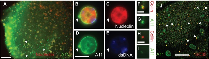 Fig. 3. Nuclear particles in isolated Xenopus nuclei (GVs) have overlapping but distinctive reactivity to amyloid detecting antibodies and thio-T. Isolated GVs were examined using an anti-oligomeric amyloid antibody A11 and particle identifying antibodies. Panel (A) shows a low magnification view of a GV using A11 (green) and anti-nucleolin (red) antibodies. Arrows point to some of the many nucleolin negative, A11 positive particles. (B-E) are higher magnification images of a single nucleolus with (B) representing the composite of (C) anti-nucleolin (red), (D) A11 antibody (green) and (E) anti-dsDNA (blue) staining. The arrowhead points to an A11 positive sub structure. Scale bars (A) 500µm and (B-E) 10µm. Coilin positive particles, histone locus bodies (F-G) and pearls (H-I) are shown as overlays of coilin (red) and A11 (green) in (F and H). The A11 signal of the histone locus body (G) is higher than that of the pearl (I). Scale bars: 5µm. The composite image of A11 and anti-SC35 used to detect speckles in (J) highlights the variable intensity of the A11 signals. In (J) speckles with low A11 signal are indicated with arrowheads and those with more robust A11 signal with arrows. Scale bar: 50μm.