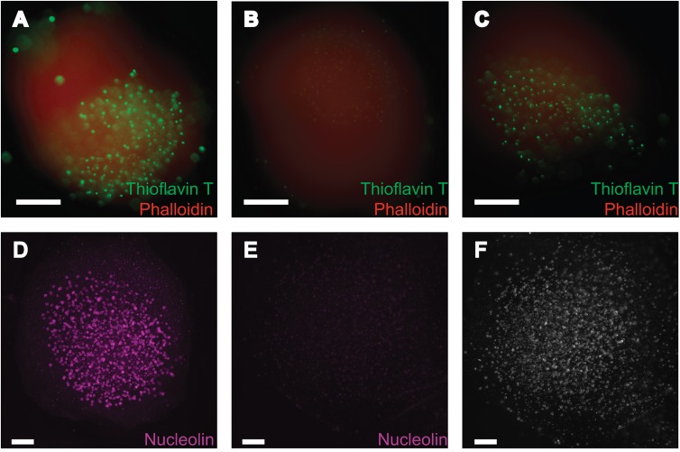 Fig. 4. Maintenance of nucleolin and thio-T staining of isolated Xenopus nuclei (GVs) is RNA dependent. (A-C) Alexa Fluor 568 Phalloidin-stained (red) stage V-VI Xenopus GVs were left untreated (A) or treated with RNase A (B) or Xrn1 (C) for 30 min in the presence of 50 μM thio-T (green). Scale bars: 100 μm. (D-F) Untreated (D) or RNase A-treated (E) GVs were immunostained for nucleolin (magenta). (F) Dark field image nucleus. Scale bars: 100 μm.