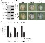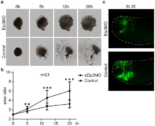 Figure 3. Elp3 is required for cranial neural crest (CNC) migration in explants and transplantation experiments.(a) CNC explants were dissected from early neurula embryos, plated on FN (10âμg/ml), and imaged at 0, 5, 12, and 20âh. The surface areas of each explant at every image point were measured, and the ratios of the areas to the values at 0âhour are shown by the line plot (b). The data were represented as the meansâ±âstandard deviation (SD). **Pâ<â0.01; ***Pâ<â0.001, two-tailed T-test. (c) GFP mRNA (100âpg) was injected into one cell at the 4-cell stage with or without Elp3 morpholino (25âng). At St.15â16, GFP-labeled CNC explants were dissected and grafted into normal host embryos. The status of the fluorescent neural crest was imaged at the tailbud stage (St.35). |