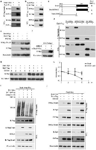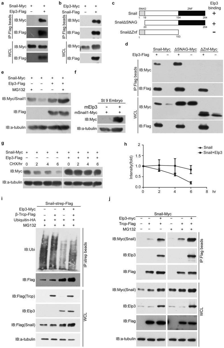 Figure 4. Elp3 interacts with and stabilizes Snail1 through inhibiting its ubiquitination.(a,b) Co-IP assays showing the interaction between Snail1 and Elp3. (c) Schematic representation of the Snail1 deletion constructs. (d) In co-IP experiments, Elp3 pulled down full length and ∆SNAG Snail1 efficiently, but not ∆Znf Snail1. (e) Co-expression of Elp3 stabilizes Snail1 in 293 cells with or without MG132 treatment (10 μM). The cells were lysed 48 hours after transfection and processed for Western blot analysis. MG132 was added 6–8 hours prior to harvesting. (f) Co-expression of mElp3 stabilizes mSnail1 in Xenopus embryo. The injected embryos were lysed at stage 9 and processed for Western blot analysis. (g,h) Elp3 affects the stability of Snail1. HEK293 cells were transiently transfected with the indicated plasmids. At 48 hours post transfection, cycloheximide (CHX) was added to all of the samples, and the cells were then harvested at the timepoints indicated (0 h, 2 h, 4 h, and 6 h). The levels of Snail1 were determined by Western blotting using the anti-Myc antibody (g). In all cases, α-tubulin was used as a loading control. The relative levels of Snail1 were quantified densitometrically and normalized against α-tubulin (h). The data shown in (h) were the average of three independent experiments and represented as the means ± standard error of mean (SEM). (i) Elp3 inhibits Snail1 ubiquitination. HEK293 cells were transiently transfected using the indicated plasmids and were treated for 4–5 hours with MG132 before harvesting. Snail1 proteins were immunoprecipitated using Strep-Tactin beads and were probed with an anti-ubiquitin antibody. (j) Co-IP experiments showing that Elp3 does not interfere with the Snail1/β-Trcp interaction. HEK293 cells were transiently transfected with the indicated plasmids and then were treated for 6–8 hours with or without MG132 before harvesting. The proteins were immunoprecipitated with anti-Flag M2 beads and then were detected with the antibody against different tags. WCL, whole cell lysate. IB, immunoblot. IP, immunoprecipitation. CHX, cycloheximide. |