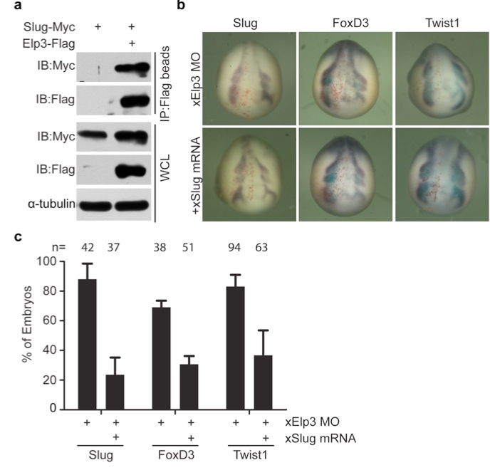 Figure S1. Elp3 interacts with xSlug and xSlug rescues neural crest migration in the Elp3 morphants. (a) mElp3 pulls down xSlug in co-IP experiment when co-expressed in HEK 293 cells. WCL, whole cell lysate. IB, immunoblot. IP, immunoprecipitation. (b) Co-expression of xSlug mRNA (150 pg/cell at 4-cell stage) in Xenopus embryo restored neural crest migration in Elp3 morphants. Whole-mount in situ hybridization with probes for neural crest markers was processed at St.19-21. LacZ mRNA was co-injected to trace the injected sides (stained red on the left sides). (c) Percentages of embryos with reduced migration of neural crest as shown in (b). The results are from three independent experiments (error bars represent SDs). |