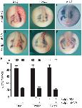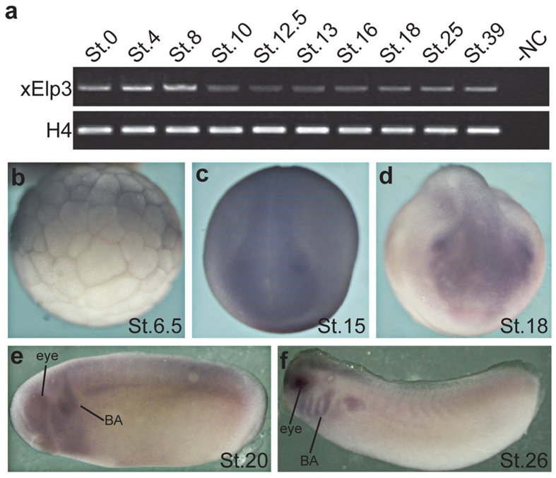 Figure 1. Expression of the Elp3 during early Xenopus development.(a) RT-PCR analysis of Elp3 expression at different stages (St.0 to St.39). (bâf). Whole-mount in situ hybridization of xElp3. Elp3 transcript is detected in the animal pole at St.6.5 (b, lateral view, animal pole to the top). At St.15, Elp3 is expressed at the anterior neural plate and its border (c, dorsal view, anterior to the bottom), and at the late neurulation, Elp3 is most abundant in cranial neural crest (d, frontal view, dorsal to the top). At tailbud stage, Elp3 is mainly expressed in the branchial arches (BA) and eyes (e,f). |
