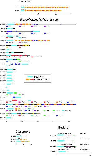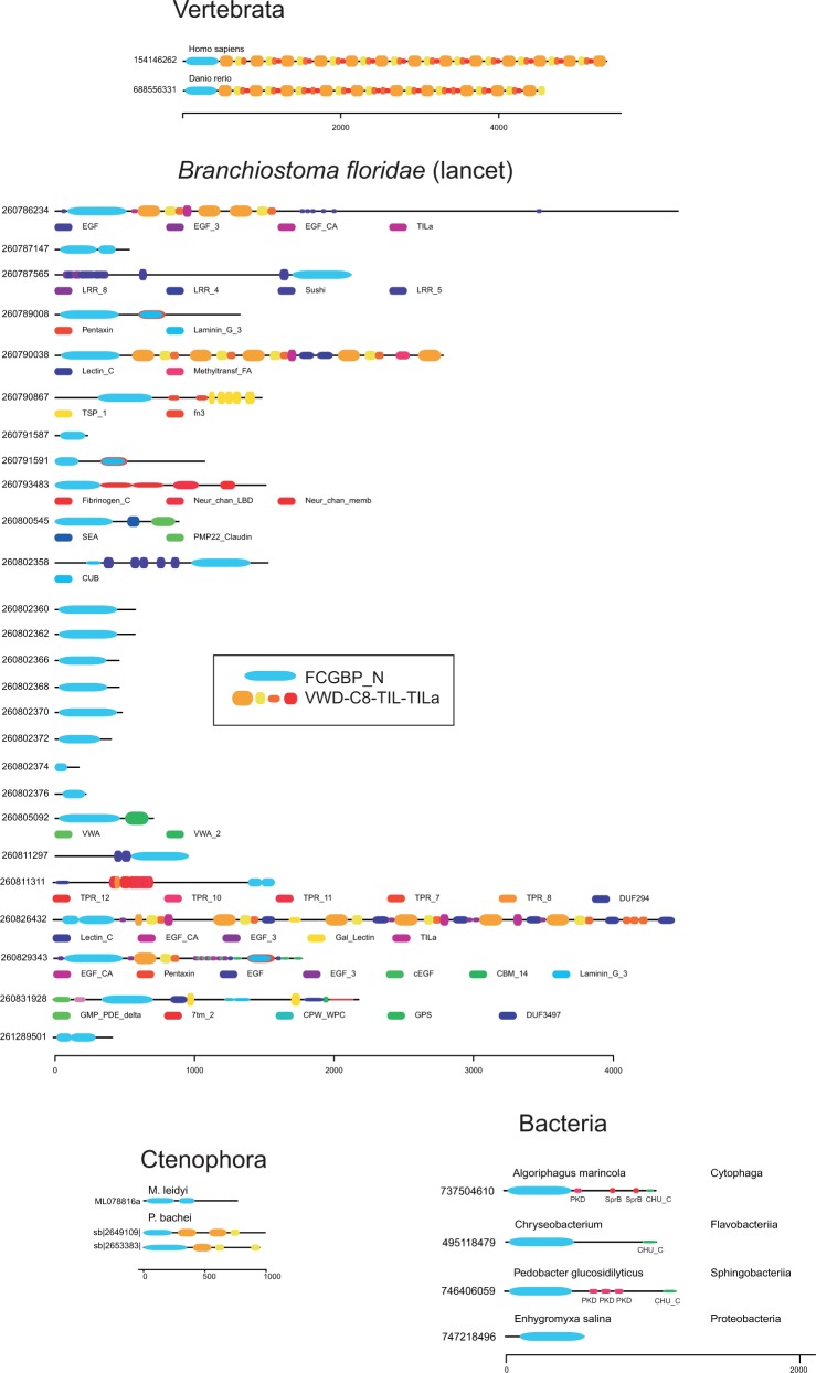 Fig. 7. Domain structures of selected proteins with a domain characteristic of FCGBP. In vertebrates, FCGBP proteins have a large number of VWD–C8–TIL units, in addition to the FCGBP_N domain. In the invertebrate B. floridae, there is a large number of proteins with the FCGBP_N domain. All domains that are not FCGBP_N, VWD, C8, TIL, TILa, or PTS domains are explained below each representation of protein domain architecture. For a complete collection of all proteins with the FCGBP domain, see supplementary figure S5, Supplementary Material online. |