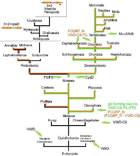 FIG. 8 Summary of mucin and FCGBP protein evolution. The VWD domain seems to occur in a restricted number of protists, but not in combination with the C8 or TIL domains. The combination of VWD/C8 appears in choanoflagellates and the structure characteristic of gel-forming mucins as well as the FCGBP_N-containing proteins appear in Ctenophora. The F5_F8 and CysD domains occur in Bilateria. A protein with FCGBP_N and multiple VWD–C8–TIL domains appears later in evolution as it is observed only in cephalochordates and vertebrates. |