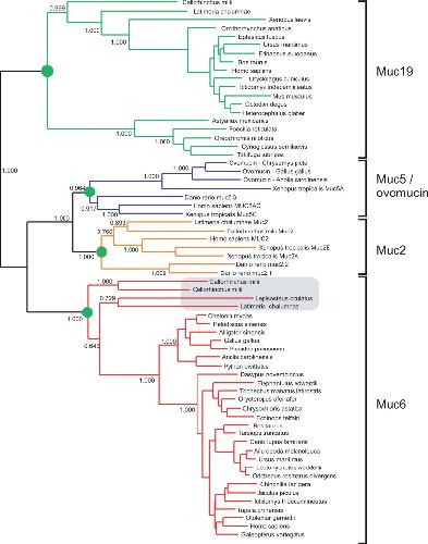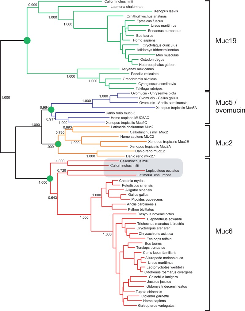 Fig. 2. The mucin Muc6 was present early in vertebrate evolution. Tree was constructed with MrBayes using an alignment of the N-terminal parts of mucins that include the three VWD–C8–TIL units. Homologs of Muc19, Muc6, Muc5, ovomucin, and Muc2 are shown. Critical nodes are labeled with green circles. The four Muc6 homologs of C. milii, L. chalumnae, and Le. oculatus clearly belong to the group of Muc6. |