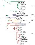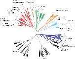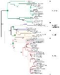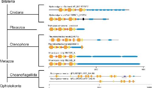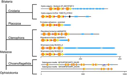 Fig. 6. Gel-forming mucins evolved early during metazoan evolution. Phylogenetic distribution of proteins in selected basal Metazoa with a domain structure characteristic of gel-forming mucins. VWD, C8, TIL, and PTS domains are shown in orange, yellow, red, and blue, respectively. |