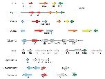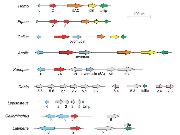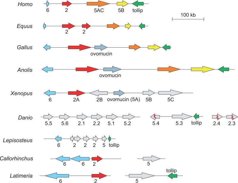Fig. 5. A conserved structure of mucin genes in vertebrates. Arrows reflect the strand polarity. In the case of X. tropicalis only a part of a larger cluster of mucin genes is shown (see also fig. 3). |