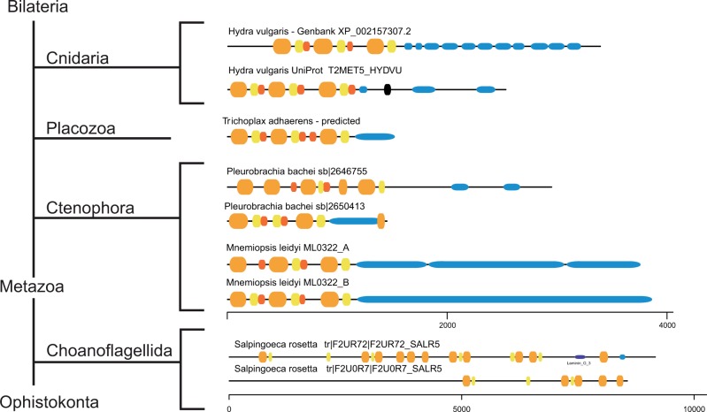 FIG. 6. Gel-forming mucins evolved early during metazoan evolution. Phylogenetic distribution of proteins in selected basal Metazoa with a domain structure characteristic of gel-forming mucins. VWD, C8, TIL, and PTS domains are shown in orange, yellow, red, and blue, respectiv |