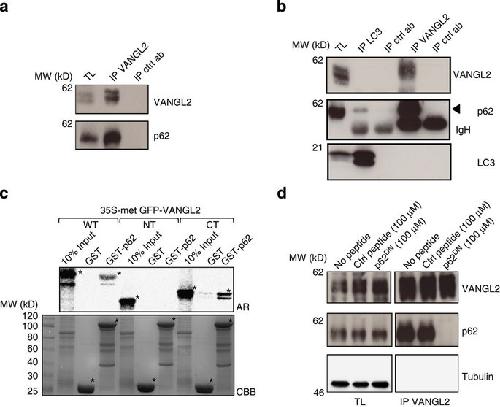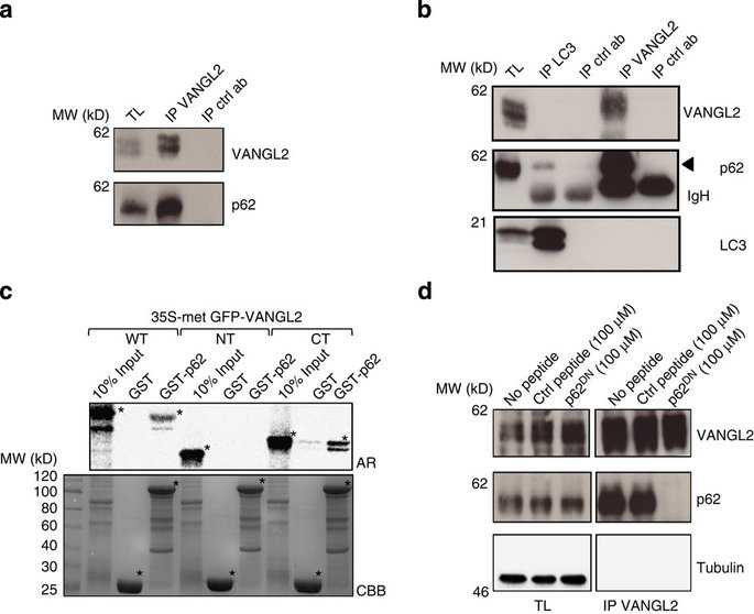 Figure 3. Identification of the signalling adapter p62/SQSTM1 as a direct binding partner of VANGL2.(a) Endogenous interaction between VANGL2 and p62/SQSTM1 is revealed by western blot analysis after immunoprecipitation using SKBR7 cell extracts. TL is total lysate. Crtl ab is an isotype-matched antibody. (b) The VANGL2âp62/SQSTM1 interaction occurs independently of LC3. Proteins were extracted from SUM149 cells and co-immunoprecipitations were carried out with the indicated antibodies. LC3 co-precipitates with p62/SQSTM1 but not with VANGL2. Reciprocally, VANGL2 co-immunoprecipitates with p62/SQSTM1 but not with LC3. IP control antibodies (IP crtl ab) are a polyclonal rabbit (for IP LC3) and a monoclonal rat antibody (for IP VANGL2). IgHs are immunoglobulin heavy chains. (c) GST pulldown assays of in vitro translated GFPâVANGL2 (full length: WT, N-terminal 1â102: NT, C-terminal 242â521: CT) showed that VANGL2 WT and CT directly bind to GSTâp62/SQSTM1 (GST-p62) but not to GST. Asterisks indicate in vitro translated VANGL2 (top panel) and GST (bottom panel) proteins. AR, autoradiography; CBB, Coomassie Brilliant Blue. (d) A p62/SQSTM1 peptide (p62DN) disrupts the endogenous VANGL2âp62/SQSTM1 complex. SUM149 cell protein extracts were incubated with the indicated peptides p62DN or scrambled control peptide (Ctrl peptide) at 100âμM. VANGL2 was then immunoprecipitated (IP VANGL2) and bound proteins were immunoblotted with the indicated antibodies. TLs showed that equal amounts of proteins were present in each condition. |