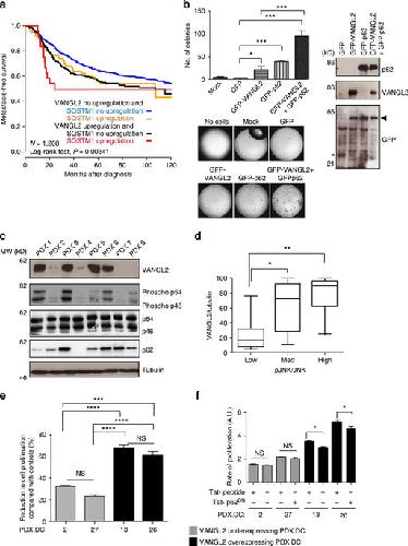 Figure 7. Disruption of the VANGL2âp62/SQSTM1 interaction in breast cancer cells.(a) KaplanâMeier MFS curves of breast cancer patients according to concomitant VANGL2 and p62/SQSTM1 mRNA expression. The 5-year MFS are 49% (both upregulated; N=27), 64% (both not upregulated; N=833) and 56% (one upregulated, the other not upregulated; N=79 and N=269). (b) Soft agar colony formation of T47D cells overexpressing GFP, GFPâVANGL2 and GFPâp62/SQSTM1 (right). Protein expression was revealed with anti-p62/SQSTM1, anti-VANGL2 and anti-GFP antibodies by western blot analysis (right). In anti-GFP blot, the arrowhead indicates position of co-migrating GFPâVANGL2 and GFPâp62/SQSTM1 and the asterisk pinpoints GFP alone. Error bars represent mean±s.d. (n=3). (c) Protein levels of VANGL2, phosphorylated JNK, JNK (p54/p46), p62/SQSTM1 and tubulin assessed in eight breast cancer PDXs (PDX 1â8) by western blot analysis. (d) VANGL2, JNK, phosphorylated JNK and tubulin signals from 30 PDX protein extracts were quantified. VANGL2/tubulin ratios were plotted against pJNK/JNK ratios, arranged in ascending order into three equally sized groups (low, medium and high). High expression of VANGL2 protein is correlated to high levels of phosphorylated JNK. Box and whisker plots show the median value and interquartile ranges. The KruskalâWallis test was used for comparison of the median levels of expression. Statistically significant differences are indicated (*Pâ¤0.05; **Pâ¤0.01). (e) Treatment of the indicated PDX-derived cells (PDX. DC-2, â27, â13 and â26) with a Tat-conjugated JNK inhibitor (Tat-JIP at 10âμM) during 48âh led to greater reduction in cell proliferation of VANGL2high/pJNKhigh than VANGL2low/pJNKlow PDX-derived cells. Comparisons use Tukey's multiple comparisons test. NS, not significant. Data are representative of three independent experiments; *Pâ¤0.05; **Pâ¤0.01; ***Pâ¤0.001; ****Pâ¤0.0001. (f) Treatment of the indicated PDX-derived cells (PDX. DC-2, â27, â13 and â26) with the p62DN peptide (225âμM) but not with control scrambled peptide (225âμM) during 48âh resulted in decreased cell proliferation of VANGL2high/pJNKhigh, but not VANGL2low/pJNKlow, PDX-derived cells. Data are representative of three independent experiments and statistical testing as stated in e. |