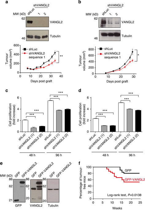 Figure 2. VANGL2 participates in tumour growth in cell culture and murine experiments.(a) Basal cell lines chosen for their high basal score/correlation were SUM149 r=0.36 (a) and HCC1806 (b) r=0.28 and threshold was 0.15. Expression of two short hairpin RNAs abrogated VANGL2 expression in SUM149 cells by western blot analysis (upper panels). SUM149 cells (5 à 106) were subcutaneously inoculated into the right flank of 4â6-week-old female NSG mice. Tumoral volume was measured at different times (lower panels). The mean and s.e.m. values (n=6, for shLuc and shVANGL2-transfected cells). The statistical significance between the data sets was determined using a two-way ANOVA test. *Pâ¤0.05, **Pâ¤0.005. (b) Same as a using HCC1806 cells, except that 1 à 106 cells were inoculated into NSG mice. (c,d) Downregulation of VANGL2 with two different shRNAs led to a decreased proliferation of SUM149 (c) and HCC1806 (d) cells. Error bars represent mean±s.d. (e) COMMA-D cells were transduced with lentiviral supernatants allowing expression of GFP or GFPâVANGL2. Cell extracts were probed by western blot analysis with anti-GFP, -VANGL2 and -tubulin antibodies. An asterisk pinpoints endogenous VANGL2. (f) KaplanâMeier curve of tumour-free status of mice transplanted with COMMA-D cells overexpressing GFP or GFPâVANGL2 (n=30). The statistical significance between the data sets was determined using a log-rank test. |