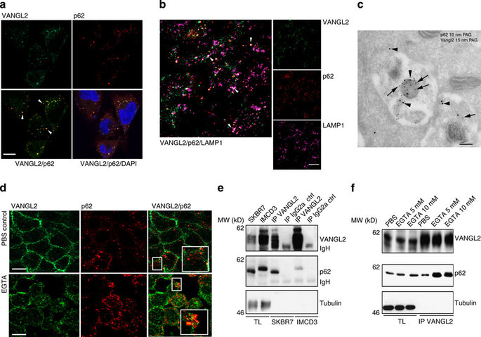 Figure 4. Colocalization of VANGL2 and p62/SQSTM1 in late endosomes.(a) Immunofluorescence staining of SKBR7 cells showed colocalization of endogenous VANGL2 (green) and p62/SQSTM1 (red) in discrete cytoplasmic puncta. Scale bar, 10âμm. The mean Pearson correlation for VANGL2 and p62/SQSTM1 is 0.62, calculated using the Image J software for â¼15 cells per field of view and from 10 images. (b) Partial colocalization of VANGL2 and p62/SQSTM1 in late endosomes of SKBR7 cells stained with the LAMP1 marker. Scale bar, 20âμm. (c) SKBR7 ells were cultured in a nutrient-deprived medium and treated with 100ânM bafilomycin A1 (6âh) before fixation. Double labelling against VANGL2 (arrowheads) and p62/SQSTM1 (arrows), as described in Methods, showed accumulations of both markers in vesicular structures probably resembling endosomes/amphisomes. Scale bar, 200ânm. (d) IMCD3 cells were treated with PBS or EGTA (5âmM) for 30âmin. Immunofluorescence and confocal analysis were performed using the indicated antibodies. Scale bar, 10âμm. Inserts show colocalized VANGL2 and p62/SQSTM1. (e) The VANGL2âp62/SQSTM1 complex was recovered in confluent SKBR7 or IMCD3 cells with 2G4 mAb (IP VANGL2) but not a control antibody (IP IgG2a ctrl) as seen using western blot analysis with the indicated antibodies. The complex was more abundant in cancer cells (SKBR7) than in polarized cells (IMCD3). Note that human (SKBR7 cells) and murine (IMCD3 cells) p62/SQSTM1 run at different molecular weights. (f) Lysates of confluent IMCD3 cells treated for 30âmin with PBS or EGTA were subjected to 2G4 mAb immunoprecipitation (IP VANGL2). Immunoprecipitated proteins were probed by western blot analysis with the indicated antibodies. Increased amounts of VANGL2âp62/SQSTM1 complexes were recovered after EGTA treatment. |