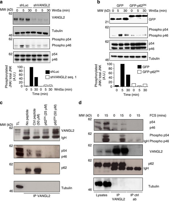 Figure 5. The VANGL2âp62/SQSTM1 complex regulates JNK phosphorylation.(a) Downregulation of VANGL2 in SUM149 cells using a specific shRNA led to reduced JNK phosphorylation induced by Wnt5a (100ângâmlâ1 for the indicated times). JNK is represented by two isoforms: p54 and p46. Wnt5a led to p46 (phospho-p46) and not p54 (phospho-54) phosphorylation. Relative quantification of immunoblots (phosphorylated JNK/total JNK) is representative from three independent experiments and use of two different shRNAs. (b) Expression of GFP-p62DN, but not GFP, in SUM149 cells led to decreased p46 JNK phosphorylation (phospho-46) induced by 100ângâmlâ1 of Wnt5a at the indicated times. Relative quantification of immunoblots (phosphorylated JNK/total JNK) is representative from three independent experiments. (c) SUM149 cell extracts were added with the control peptide (Ctrl peptide) or the p62/SQSTM1 peptide (p62DN) that inhibited recruitment of JNK and p62/SQSTM1 to VANGL2. (d) Proteins extracted from SUM149 cells treated or not with serum were immunoprecipitated with anti-VANGL2 antibody and blotted with the indicated antibodies. p62/SQSTM1, JNK and phosphorylated JNK (phospho-p54 and phospho-p46) were present in the VANGL2 complex. |