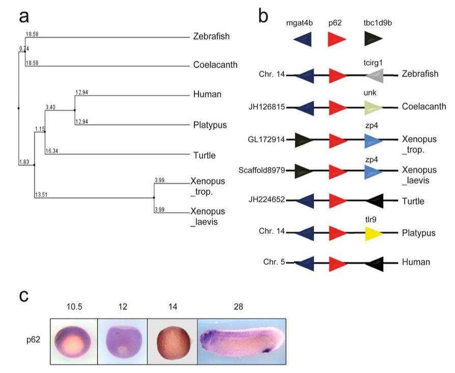Supplementary Figure 6: p62/SQSTM1 homologues are conserved in the Xenopus genome and have overlapping expression patterns to VANGL2. (a) Phylogenetic tree of p62/SQSTM1 sequences from different vertebrate species. (b)Synteny of the p62/SQSTM1 genomic region. (c) Expression pattern of p62/SQSTM1 in Xenopus laevis embryos (In situ hybridization). |