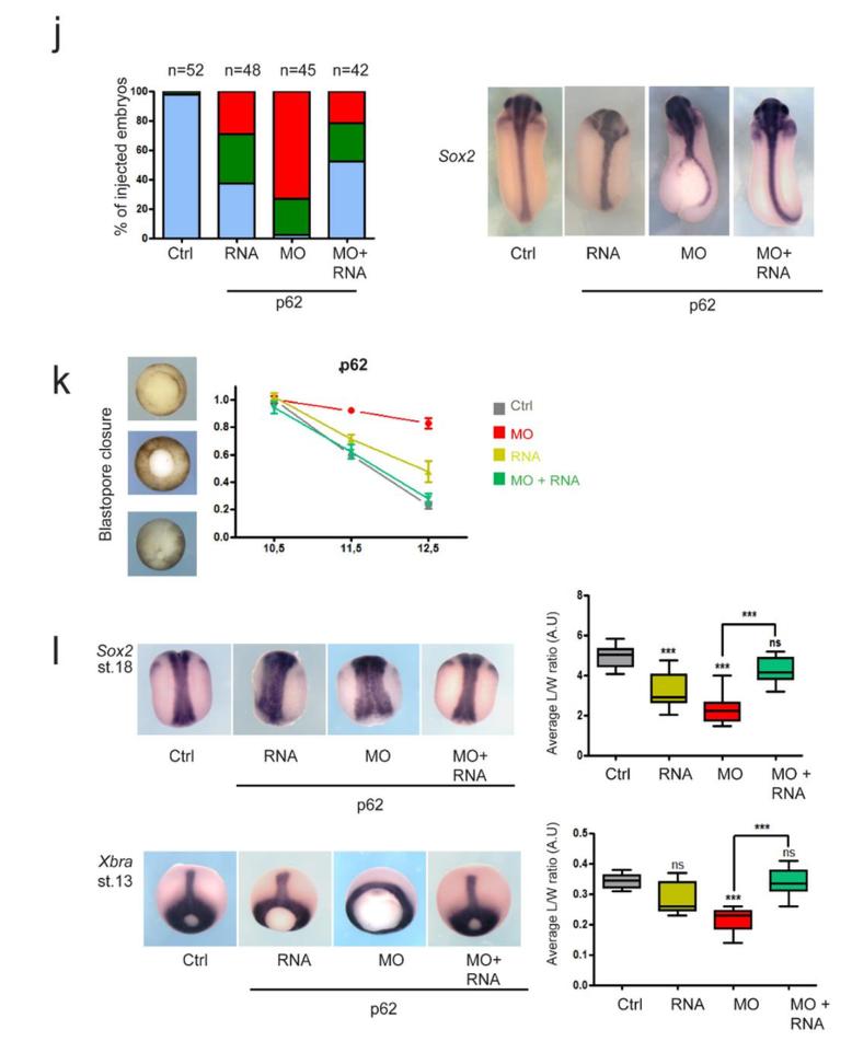 Supplementary Fig. 6 related to Fig. 6: Xenopus p62/SQSTM1 loss of function is rescued by human p62/SQSTM1. (j) Two-cell embryos were injected in each blastomere with 50 ng of p62 MO followed by injection at four-cell stage of synthetic human p62 mRNA (2.5 ng in each blastomere). Morphology was scored at tailbud stage, and embryos were then stained with Sox2 probe to highlight neural tube defects. The number of embryos analysed in each condition is displayed on the graph. (k) Quantification of blastopore rescue. Blastopore closure was estimated using the ratio of blastopore diameter at indicated stages to the mean of control (ctrl) blastopore diameter at st.10.5. Bars represent maximum and minimum values, and lines represent the mean. Approximately 30 embryos per condition were scored. (l) Embryos were processed for WISH analysis at mid-neurula and late gastrula stages. Average neural tube Length/Width ratio for embryos stained with Sox2 probe (n=11) or average notochord length for embryos stained with Xbra probe (n=11) were calculated. Five independent rescue experiments were scored. One-way-ANOVA with Tukey test (95 % confidence intervals) were applied (***Pâ¤0.0005). |