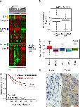 Figure 1. Overexpression of VANGL2 in breast cancer.(a) Hierarchical clustering of the 208 breast cancers and 4 NB samples (columns) and the 12,304 most variable genes (rows). According to a log2 pseudocolour scale (bottom), red indicates a high level of mRNA expression compared with the median value across all samples, whereas green indicates a low level of expression. The magnitude of deviation from the median is represented by the colour saturation. The dendrogram of samples (above matrices) represents overall similarities in gene expression profiles. To the left of the colour matrix are represented some biologically relevant gene clusters (orange: extracellular matrix cluster (ECM); pink: ERBB2 cluster; blue: luminal/ER cluster; green: immune cluster; red: basal cluster). A few genes of the basal cluster are shown, including VANGL2, as well as classical basal genes (KRT5, KRT6, KRT17 and CRYAB). (b) Box and whisker plots of VANGL2 expression across 208 breast cancer samples profiled by both expression DNA arrays and aCGH, and according to (Student's t-test) VANGL2 genomic status: with (left, 104 samples) versus without (right, 104 samples) gain defined as a DNA copy number ratio tumour/NB⩾1.5). (c) Box and whisker plots of VANGL2 expression across 2,687 breast cancer samples according to molecular subtypes. Expression values are NB-centred. The horizontal black line represents the level of expression of VANGL2 in NB tissue. Differences between the subtypes were tested for significance using one-way analysis of variance (ANOVA). For each box and whisker plot, the median value and interquartile ranges are indicated. (d) KaplanâMeier MFS curves in breast cancer patients according to VANGL2 mRNA expression. The 5-year MFS are 55% (upregulation; N=296) and 64% (absence of upregulation; N=912). (e) Immunohistochemistry experiment using anti-VANGL2 2G4 monoclonal antibody (mAb) shows that VANGL2 is more expressed in tumour cells (tumour) than in the stromal tissue (stroma) in basal breast cancer. Scale bar, 10âμM. |