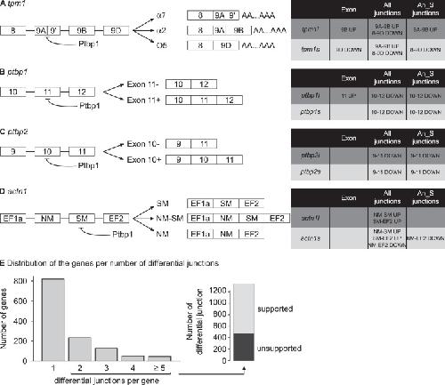 Fig. 5. Analysis of genes known to be regulated by Ptbp1 in Xenopus. A, tpm1 ( Hamon et al., 2004), B, ptbp1 ( Méreau et al., 2015), C, ptbp2 ( Méreau et al., 2015), D, actn1 ( Le Sommer et al., 2005). Left, for each gene, the Ptbp1-repressed exon and the genomic region encompassing it, as well as the different RNA processing patterns, are diagrammed. Introns are represented as horizontal lines and exons as boxes. Right, tables summarizing the exons and junctions identified as differential in ptbp1 morphants by either of the three approaches. Due to Xenopus laevis tetraploidization, each gene is present as two pseudo-alleles indicated âlâ and âsâ. E, Number of genes with the indicated numbers of differential junctions retrieved by the all-junction approach (left part). Number of differential junctions, among the genes harboring at least 2 differential junctions, supported or not by another differential junction (right part). |