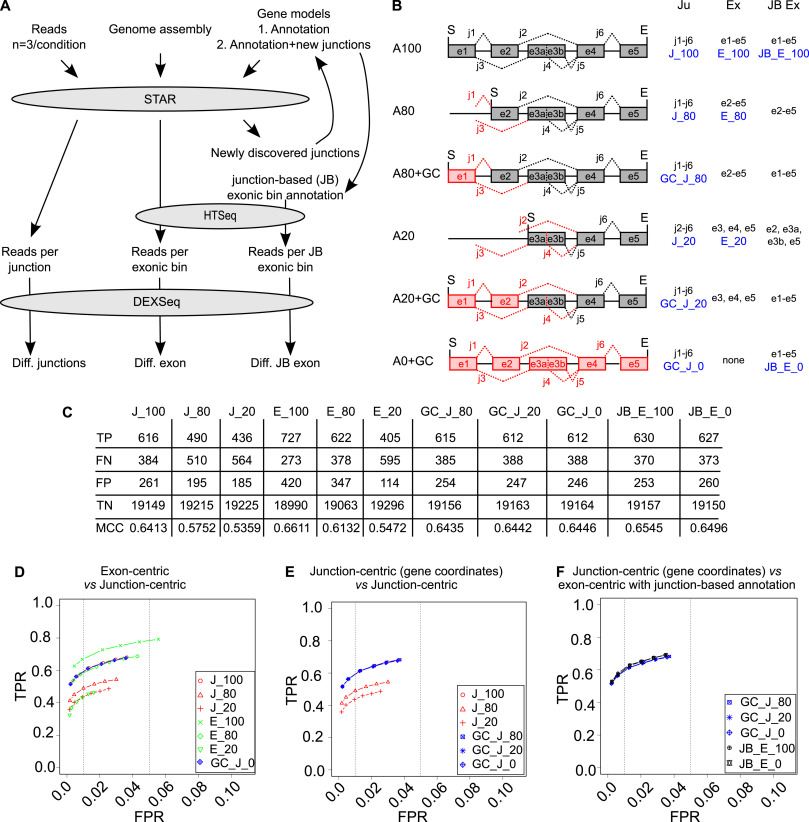 Fig. 1. Comparison of exon-centric and junction-centric approaches with simulated data. A, Overview of the analysis protocols for the RNAseq data. Starting from 6 RNAseq datasets (2 triplicates), we used the mapper STAR in two successive passes to obtain the numbers of reads per junction for each sample. We also used the sequencing data to reconstruct gene models and generate junction-based (JB) exonic regions annotation. We next used HTSeq to count the number of reads in each exonic region (solely based on the preexisting annotation of using the novel JB annotation). We analysed statistically the data with DEXSeq to identify differential junctions, differential exons, and differential JB exons. B, Cartoon illustrating the impact of degrading the annotation on the identification of exons and junctions of a hypothetical gene. A100 corresponds to the perfect annotation and A80, A20 and A0 to a situation where 80%, 20% and 0% of the annotated exons, respectively, are retained. With GC, the correct gene coordinates (start S and end E) are provided in the analysis irrespective of the degree of exonic annotation degradation. The exons and junctions present in the preexisting annotation are in black and those inferred from the sequencing data are in red. C, Number of TP, FN, FP and TN, and Matthews correlation coefficient (MCC) in the situations shown in blue in B, with an adjusted p-value threshold set at 0.05. DâF. ROC curves obtained by plotting the true positive rate [TP/(TP+FN)] against the false positive rate [FP/(FP+TN)] for different p-value thresholds (0.001, 0.01, 0.05, 0.10, 0.15, 0.20). |