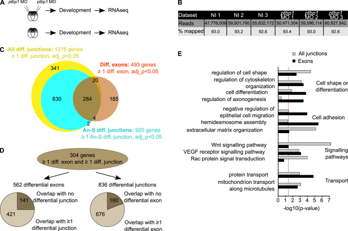 Fig. 2. Comparison of the exon-centric and junction-centric approaches to identify differential splicing patterns in Xenopus laevis. A, RNAseq was carried out from 3 independent pools of stage 28 embryos injected with the morpholino against ptbp1 mRNA (ptbp1 MO), or left uninjected. B, Table summarizing RNAseq data. â% mappedâ is to the percentage of read pairs uniquely mapped to the Xenopus genome (v9.1). C, Venn diagram showing the overlap of the genes with at least one differential exon, the genes with at least one annotation-supported differential junction, and the genes with at least one differential junction. D, For the 304 (284+20) genes with at least one differential exon and one differential junction, we indicate the numbers of differential exons and junctions. The pie charts show the percentage of differential exons associated with one differential junction (left), and the percentage of differential junctions associated with one differential exon (right). E, Comparison of enriched GO terms in differentially spliced genes identified by the junction-centric and the exon-centric approaches. The dotted red line indicates p=0.05. The GO terms are on the left, and we clustered the enriched GO terms in 4 main classes (right). |