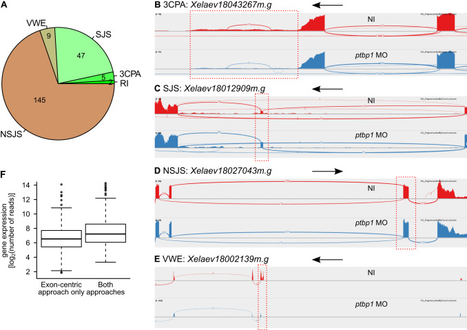 Fig. 4. Analysis of the genes only identified by the exon-centric approach. A, We manually classified the 189 genes with one or more differential exon, but without any differential junction, into 5 classes: RI (retained intron), 3CPA (differential exon 3â² to a cleavage and polyadenylation site), SJS (supported by a junction in Sashimi plots), VWE (very weakly expressed) and NSJS (non-supported by a junction in Sashimi plots). The pie chart shows the distribution of the genes between these 5 classes. BâE, Sashimi plots of representative genes within each of 4 classes (no gene belonging to the RI class is shown since this class only contains two members). The orientations of the gene are given by the arrows. The genomic regions identified as a differential exon are circled dotted red. F, Boxplot of the number of reads per gene, for genes identified with the exon-centric approach only and genes identified with both the exon-centric and the all-junctions-centric approaches. |
