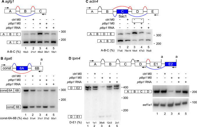 Fig. 6. Confirmation of newly discovered Ptbp1-controlled splicing events. A, agfg1, B, itga6, C, actn4, D, tpm4. Upper panels, genomic region encompassing the Ptbp1-regulated exons. Introns are represented as horizontal lines and exons as boxes. The exons are given arbitrary names, and their genomic coordinates are given in Table ST6. âaâ stands for polyadenylation signal. The splice junctions are positioned along the gene structure. The junctions shown in black were not detected as differently used in control embryos and ptbp1 morphants, while the junctions shown in red and blue were detected as significantly (adjusted p<0.05) increased and decreased, respectively, in ptbp1 morphants. The exons in blue were detected as significantly (adjusted p<0.05) decreased in ptbp1 morphants. Lower panels, autoradiograms of representative RT-PCR experiments carried out with RNAs extracted from stage 28 embryos previously injected with the indicated molecules, and using the primers indicated by arrows in the upper panels. In all the experiments, the primers are designed to amplify both pseudo-alleles, and the forward primer is radiolabeled (*). The quantifications below the gels are means±s.d. of 3 independent experiments. A, agfg1 pre-mRNA contains a cassette exon (B), and its splicing was analysed with primers in flanking exons A and C. B, itga6 pre-mRNA contains a cassette exon (6A), and its splicing was analysed with primers in the constitutive flanking exons âconstâ and 6B. C, actn4 pre-mRNA contains a set of mutually exclusive exons (C and D), and its splicing was analysed with primers in flanking exons A and E, with Sac1 digestion before gel loading. D, tpm4 pre-mRNA contains two alternative terminal exons (E1 and E2), and its splicing was analysed with one forward primer in exons D and reverse primers in exons E1 and E2. Exons E2 of tpm4l and tpm4s differ by an indel located in the 3â²UTR, explaining that the D-E2 amplimere is a doublet. The total amount of tpm4 mRNA was appraised from RT-PCR with primers in exons A and D, and eef1a1 (EF1α) confirmed similar RNA extractions. |