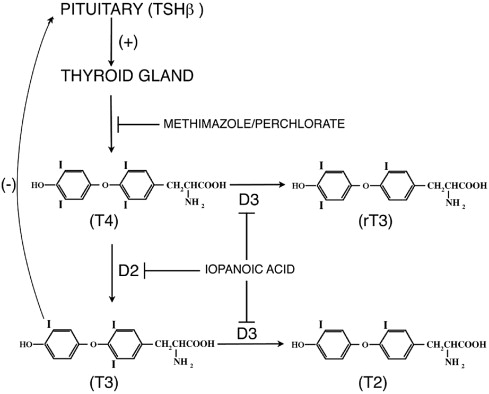 Fig. 2. The negative feedback loop between the thyroid gland and the anterior pituitary regulates the circulating levels of T4. Throughout tadpole growth TSH is secreted by the anterior pituitary and stimulates the thyroid gland to synthesize increasing amounts of T4. However, TSH production is not shut down until D2 is up-regulated at metamorphic climax in the anterior pituitary (Huang et al., 2001) and converts local T4 to the active hormone T3. This figure shows where pharmacological inhibitors interfere with the formation or inactivation of thyroid hormone. |