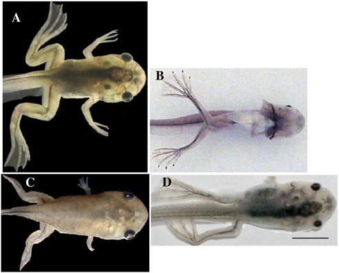 Fig. 3. Limb phenotypes at climax (NF62). (A) Control. A dominant negative form of the thyroid receptor is expressed in (B) neural tissue; (C) collagen and skeletal structures; (D) muscle. This figure was taken from Brown et al. (2005). Scale bar: 2Â mm. |