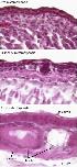 Fig. 4. Skin remodeling. The tadpole epidermis (upper) has 3 cell layers covering a collagen lamella and contains no glands. The cells in all three layers replicate. At climax (middle) a dermis forms, and two different kinds of skin glands appear for the first time. The skin becomes a germinative epithelium with replication only in the basal cell layer. |