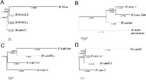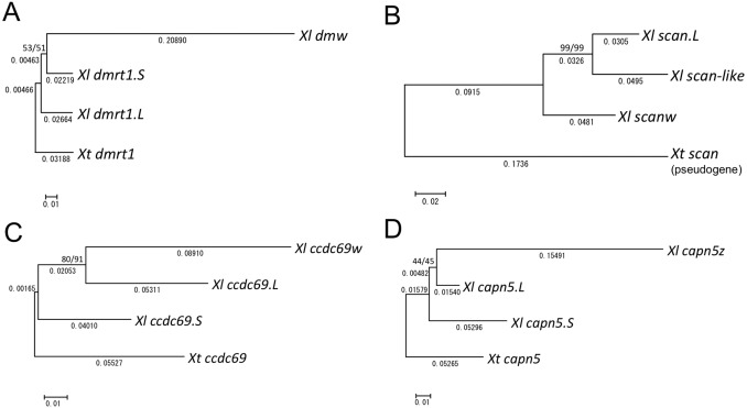 Fig. 3. Phylogenetic analyses of the W- or Z-specific genes. Phylogenetic trees obtained with the MEGA6 program based on the W/Z-specific nucleotide sequences, dmw (A), scanw (B), ccdc69w (C), and capn5z (D), which were constructed using the paralogous sequences in X. laevis and the most highly related homologous sequences in X. tropicalis as the outgroup. In the NJ and ML analyses, the best-fit model of nucleotide substitution was selected by model selection. An identical topology was obtained for each gene in the two analyses. The NJ trees are shown as representative examples. Numbers at each node denote the NJ/ML bootstrap percentage values based on 1000 replicates. |