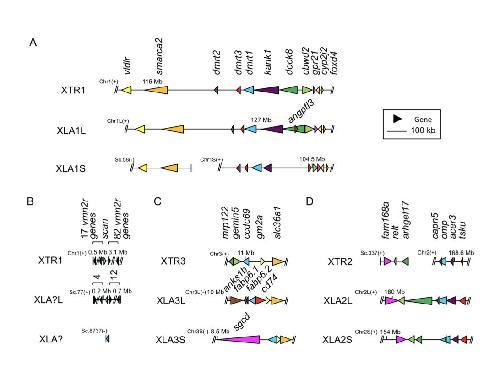 Supplementary Fig. 7. Synteny analyses of the ancestral genes of the four W/Z-specific genes in X. laevis and X. tropicalis. Synteny of dmrt1 (A), scan (B), ccdc69 (C), and capn5 (D) as ancestral genes of dmw, scanw, ccdc69, and capn5z, respectively. Triangles indicate genes and the tips correspond to their 3ʹ ends. XLA and XTR represent the chromosomes of X. laevis and X. tropicalis, respectively. sc., scaffold. |
